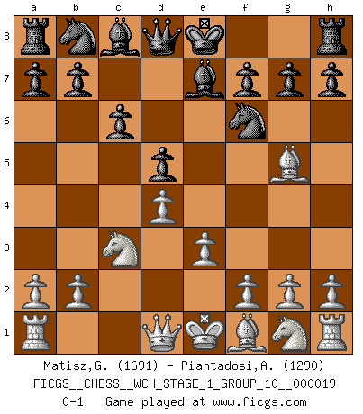 Last move : 0-1 2018 May 2 10:30:26 [Event "FICGS__CHESS__WCH_STAGE_1_GROUP_10__000019"] [Site "FICGS"] [Date "2018.03.23"] [Round "1"] [White "Matisz,Gergely"] [Black "Piantadosi,Angelo"] [Result "0-1"] [WhiteElo "1691"] [BlackElo "1290"] 1.d4 d5 2.c4 e6 3.Nc3 Nf6 4.cxd5 exd5 5.Bg5 Be7 6.e3 c6 0-1 This chess game has been lost on time (started : 2018.03.23 18:24:53) QGD : Exchange, positional line Player Black won this chess game. Follow this game move after move (download)The enormous mental resilience, without which no Chess player can exist, was so much taken up by Chess that he could never free his mind of this game. (Albert Einstein) Das Schach ist nichts für kleine Geister, es beansprucht einen vollen Mann, der sich nicht sklavisch an das Überlieferte hält, sondern selbständig die Tiefen des Spiels zu ergründen sucht. (Wilhelm Steinitz) El Ajedrez hace al hombre ser mas sabio y ver mas claro. (Vladimir Putin) Même un GMI sait rarement calculer sur plus de cinq coups une attaque à sacrifices. (Rudolf Spielmann) Luck is when opportunity knocks and you answer. (Anonymous)