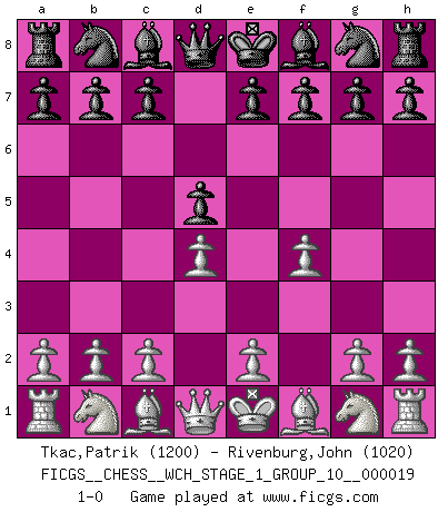 Last move : 1-0 2018 May 13 11:13:15 [Event "FICGS__CHESS__WCH_STAGE_1_GROUP_10__000019"] [Site "FICGS"] [Date "2018.03.23"] [Round "1"] [White "Tkac,Patrik"] [Black "Rivenburg,John"] [Result "1-0"] [WhiteElo "1200"] [BlackElo "1020"] 1.f4 d5 2.d4 1-0 This chess game has been lost on time (started : 2018.03.23 18:24:53) Bird's Opening Player White won this chess game. Follow this game move after move (download)All I want to do, ever, is just play Chess. (Bobby Fischer) Kritik überlasse ich den Spießern. Ich zeige nichts, wofür ich mich schämen muss. (Alexandra Kosteniuk) El Ajedrez es una manera fabulosa para que los niños aprendan a autovalorarse y a autoestimarse. (Saudin Robovic) Je crois qu'il existe des manières très spécifiques de jouer efficacement contre une machine. Evidemment, nous n'avons aucune chance en technique pure, parce que l'ordinateur calcule de manière parfaite. Mais lorsque nous faisons appel à notre cerveau, en utilisant l'intuition et la compréhension, alors nous restons beaucoup plus forts. (Anatoli Karpov) CHESS, n. f. [echecs, Fr.] A nice and abstruse game, in which two sets of puppets are moved in opposition to each other. (Dr Samuel Johnson, A Dictionary Of The English Language, 1755)