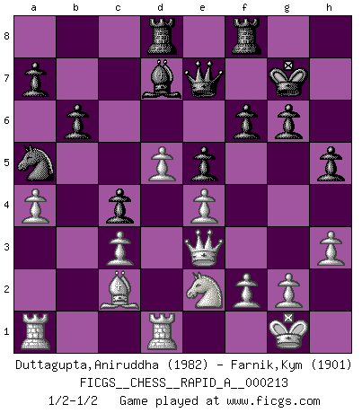 Last move : 1/2-1/2 2018 May 14 8:54:20 [Event "FICGS__CHESS__RAPID_A__000213"] [Site "FICGS"] [Date "2018.03.24"] [Round "1"] [White "Duttagupta,Aniruddha"] [Black "Farnik,Kym"] [Result "1/2-1/2"] [WhiteElo "1982"] [BlackElo "1901"] 1.d4 Nf6 2.c4 g6 3.Nc3 d5 4.cxd5 Nxd5 5.e4 Nxc3 6.bxc3 Bg7 7.Bc4 c5 8.Ne2 Nc6 9.Be3 O-O 10.O-O Qc7 11.Rc1 b6 12.Qd2 Bb7 13.Bh6 e6 14.Bxg7 Kxg7 15.Qe3 Qe7 16.Rfd1 Na5 17.Bd3 Rad8 18.Nf4 e5 19.Ne2 f6 20.d5 c4 21.Bc2 Bc8 22.a4 h5 23.h3 Bd7 24.Ra1 1/2-1/2 King's Indian defense, 3.Nc3 Kingside Castling by player Black (move 9) Kingside Castling by player White (move 10) This chess game ended in a draw. Follow this game move after move (download)As one by one I mowed them down, my superiority soon became apparent. (Jose Capablanca) Ein Buch ist ein Spiegel; wenn ein Affe hineinsieht, so kann kein Apostel heraus gucken. (Georg Christoph Lichtenberg) No hay precio que no valga la pena por la cabellera del Rey enemigo. (Koblentz) Le succès, c'est être capable d'aller d'échec en échec sans perdre son enthousiasme. (Winston Churchill) Wisdom doesn't necessarily come with age. Sometimes age just shows up all by itself. (Tom Wilson)