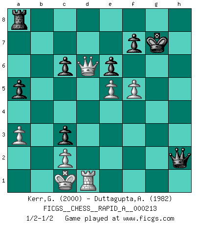 Last move : 1/2-1/2 2018 May 1 21:15:17 [Event "FICGS__CHESS__RAPID_A__000213"] [Site "FICGS"] [Date "2018.03.24"] [Round "1"] [White "Kerr,Graham"] [Black "Duttagupta,Aniruddha"] [Result "1/2-1/2"] [WhiteElo "2000"] [BlackElo "1982"] 1.e4 e6 2.d4 d5 3.Nc3 Bb4 4.e5 c5 5.a3 Bxc3+ 6.bxc3 Ne7 7.Qg4 cxd4 8.Qxg7 Rg8 9.Qxh7 Qc7 10.Ne2 Nbc6 11.f4 dxc3 12.Qd3 d4 13.Nxd4 Nxd4 14.Qxd4 Bd7 15.Rg1 Nf5 16.Qf2 Qc6 17.Bd3 Qd5 18.Be3 Nxe3 19.Qxe3 Rxg2 20.Rxg2 Qxg2 21.Be4 Qxh2 22.O-O-O Bc6 23.Bxc6+ bxc6 24.Qd4 a5 25.Qd7+ Kf8 26.Qd6+ Kg7 27.f5 1/2-1/2 Comment by player 1 : Graham Kerr : gg, thanks ;-) French : Winawer, Advance, poisoned pawn variation Queenside Castling by player White (move 22) This chess game ended in a draw. Follow this game move after move (download)Dazzling combinations are for the many, shifting wood is for the few. (Georg Kieninger) Auf Remis zu spielen ist gewissermaßen ein Verbrechen gegen das Schachspiel. (Mikhail Nekhemyevich Tal) Un jugador que trata de regresar una movida en el Ajedrez es un futuro carterista. (Richard Fenton) Il n'y a pas eu de défaite parce que je ne crois pas que cet ordinateur ait jamais existé. IBM a triché en refusant d'imprimer les modes de recherche de la machine. C'est évident, pendant le match, des coups décisifs ont été joués par des êtres humains. Aujourd'hui, les meilleurs spécialistes en informatique ne peuvent toujours pas expliquer comment Deep-Blue a pu jouer contre la logique des ordinateurs. IBM a gagné une guerre de communication, mais ils sont incapables de prouver que l'ordinateur a gagné tout seul. (Garry Kasparov) A good player is always lucky. (Capablanca)