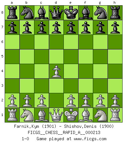 Last move : 1-0 2018 April 23 9:44:29 [Event "FICGS__CHESS__RAPID_A__000213"] [Site "FICGS"] [Date "2018.03.24"] [Round "1"] [White "Farnik,Kym"] [Black "Shishov,Denis"] [Result "1-0"] [WhiteElo "1901"] [BlackElo "1900"] 1.d4 1-0 This chess game has been lost on time (started : 2018.03.24 4:32:17) Queen's pawn Player White won this chess game. Follow this game move after move (download)The Chess pieces are the block alphabet which shapes thoughts; and these thoughts, although making a visual design on the chessboard, express their beauty abstractly, like a poem. (Marcel Duchamp) Privat ist Kortschnoi kein schlechter Mensch, sehr sympathisch. Aber während des Spiels ist er grausam. Er will dich töten. (Miguel Najdorf) La maestría del Ajedrez consiste esencialmente en analizar posiciónes de Ajedrez con precisión. (Mikhail Botvinnik) Karpov est une pièce de musée. (Garry Kasparov) At last I discovered the true beauty of chess. So I proposed to her. (Dinesh De Silva)