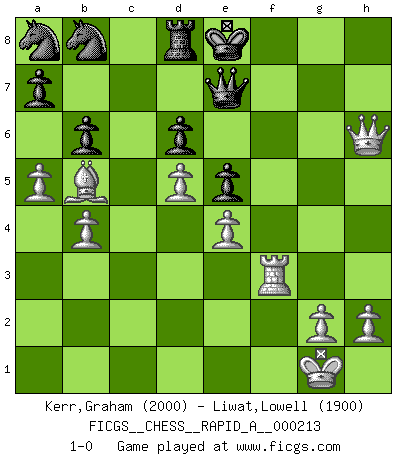 Last move : 1-0 2018 March 30 1:30:2 [Event "FICGS__CHESS__RAPID_A__000213"] [Site "FICGS"] [Date "2018.03.24"] [Round "1"] [White "Kerr,Graham"] [Black "Liwat,Lowell"] [Result "1-0"] [WhiteElo "2000"] [BlackElo "1900"] 1.e4 c5 2.Nf3 Nc6 3.d4 cxd4 4.Nxd4 e5 5.Nb5 d6 6.c4 Nf6 7.N5c3 Be7 8.Bd3 O-O 9.O-O Be6 10.Nd5 Nd7 11.Nxe7+ Qxe7 12.Nc3 Nd4 13.Be3 Nc6 14.b3 Nc5 15.Bc2 Kh8 16.Qd2 b6 17.f3 Rad8 18.Nd5 Bxd5 19.cxd5 Nb8 20.b4 Nca6 21.Bd3 Nc7 22.a4 h6 23.a5 Na8 24.f4 f6 25.fxe5 fxe5 26.Bxh6 gxh6 27.Qxh6+ Kg8 28.Ra3 Rxf1+ 29.Bxf1 Kf7 30.Rf3+ Ke8 31.Bb5+ 1-0 Graham Kerr gg Sicilian : Labourdonnais-Loewenthal (Kalashnikov) variation Kingside Castling by player Black (move 8) Kingside Castling by player White (move 9) Player White won this chess game. Follow this game move after move (download)If cunning alone were needed to excel, women would be the best Chess players. (Albin) Das Schachspiel ist ein See, in welchem eine Mücke baden und ein Elefant ertrinken kann. (Emanuel Lasker) No hay otro maestro que tenga una voluntad terrífica de ganar. Al tablero, el irradía peligro y aún los oponentes mas fuertes tienden a congelarse como liebres cuando olfatean a una pantera. Aún sus debilidades son peligrosas. Con las blancas, su juego de apertura es predecible - te es posible hacer planes en su contra - pero es tan fuerte que tus planes casi nunca funcionan. En el juego medio, su precisión e invención son fabulosas y en finales, tú simplemente no le puedes vencer. (Experto Alemán anónimo) Il n'y a pas de prix trop élevé au scalp de l'ennemi. (Koblentz) I teach you to lie, cheat and steal, and as soon as my back's turned you wait in line ? (Gregory House, House M.D.)