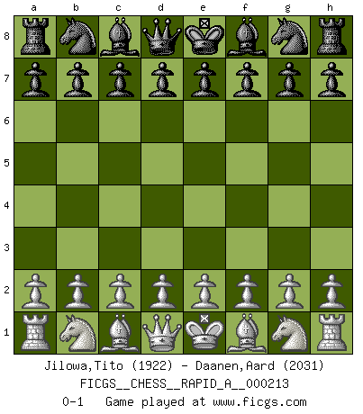 Last move : 0-1 2018 April 23 9:44:29 [Event "FICGS__CHESS__RAPID_A__000213"] [Site "FICGS"] [Date "2018.03.24"] [Round "1"] [White "Jilowa,Tito"] [Black "Daanen,Aard"] [Result "0-1"] [WhiteElo "1922"] [BlackElo "2031"] 0-1 This chess game has been lost on time (started : 2018.03.24 4:32:17) Player Black won this chess game. Follow this game move after move (download)On the chessboard, lies and hypocrisy do not survive long. (Emanuel Lasker) Ein Remis kann durch Wiederholung von drei Zügen oder durch einen schlechte Zug erreicht werden. (Savielly Grigorievitsch Tartakower) TodavÃa soy una vÃctima del Ajedrez. Tiene toda la belleza del arte y mucho mas. No puede ser comercializado. El Ajedrez es mas puro que el arte en su posición social. (Marcel Duchamp) On a dit que l'homme se distingue de l'animal par le fait qu'il achète plus de livres qu'il ne peut en lire. Je voudrais suggérer qu'inclure à la liste des livres quelques livres d'échecs rendrait la distinction manifeste. (Edward Lasker) Empty your mind, be formless, shapeless — like water. (Bruce Lee)