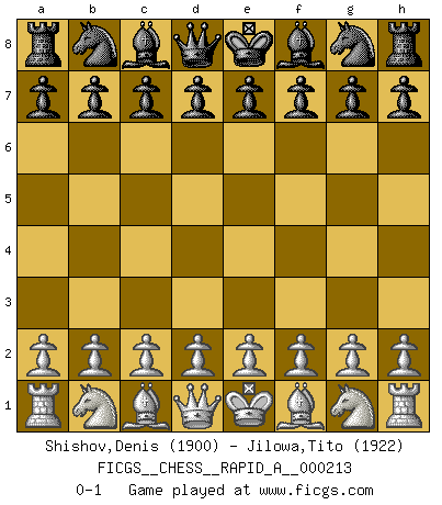 Last move : 0-1 2018 April 23 9:44:29 [Event "FICGS__CHESS__RAPID_A__000213"] [Site "FICGS"] [Date "2018.03.24"] [Round "1"] [White "Shishov,Denis"] [Black "Jilowa,Tito"] [Result "0-1"] [WhiteElo "1900"] [BlackElo "1922"] 0-1 This chess game has been lost on time (started : 2018.03.24 4:32:17) Player Black won this chess game. Follow this game move after move (download)Bobby just drops the pieces and they fall on the right squares. (Miguel Najdorf) Ivan Sokolov treibt mich als Beifahrer an mit go Loeky go - . (Loek van Wely) Bobby Fischer es el mas grande genio de Ajedrez de todos los tiempos. (Alexander Kotov) Plusieurs personnes se sont demandées comment Tal faisait pour gagner... En fait, c'est très simple ! Il met ses pièces au centre de l'échiquier et les sacrifie quelque part ! (David Bronstein) Work expands to fill the time available. (C. Northcote Parkinson, in Parkinson's Laws)