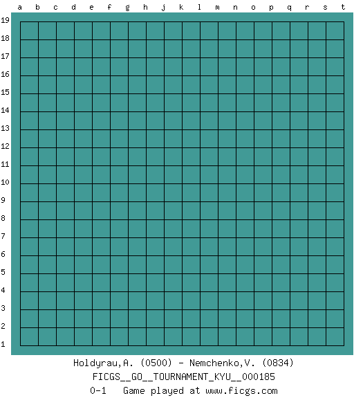 Last move : 0-1 2018 April 23 9:44:29 [Event "FICGS__GO__TOURNAMENT_KYU__000185"] [Site "FICGS"] [Date "2018.03.24"] [Round "1"] [Black "Holdyrau,Andrey"] [White "Nemchenko,Valery"] [Result "0-1"] [Rating 1 "0500"] [Rating 2 "0834"] 0-1 This go game has been lost on time (started : 2018.03.24 4:33:28) Here are the names of the openings (joseki) played in the four corners : Player White won this Go (weiqi, baduk) game. Follow this game move after move (download)Strike at the waist of the knight's move. (Anonymous) The message for business people contemplating their place in the cyberspace is simple and direct: get linked or get lost. (Vic Sussman and Kenan Pollack)