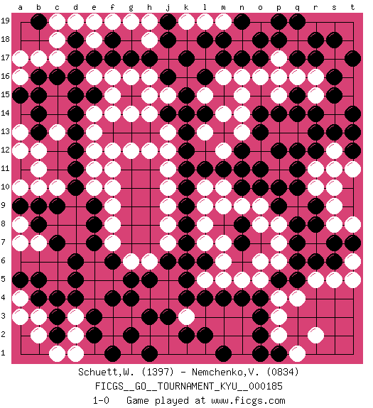 Last move : 1-0 2018 November 7 19:55:21 [Event "FICGS__GO__TOURNAMENT_KYU__000185"] [Site "FICGS"] [Date "2018.03.24"] [Round "1"] [Black "Schuett,Wilhelm"] [White "Nemchenko,Valery"] [Result "1-0"] [Rating 1 "1397"] [Rating 2 "0834"] 1.d16 q4 2.d4 q16 3.o3 p3 4.o4 p4 5.k4 o5 6.m4 n5 7.n4 m5 8.q10 l5 9.o17 p16 10.m17 o16 11.k17 n16 12.n17 m16 13.d10 f10 14.o2 p2 15.q8 o6 16.q6 p6 17.q5 r5 18.r6 s5 19.p5 p7 20.q7 p8 21.p9 o9 22.o10 n9 23.e9 f9 24.e7 f8 25.e8 f7 26.r14 q14 27.r13 q13 28.r12 q12 29.d12 f11 30.d14 e12 31.f4 e6 32.d6 e5 33.d5 e4 34.e3 f5 35.g5 g6 36.f6 h6 37.e17 e13 38.d13 e14 39.h17 h16 40.j16 g16 41.g17 f16 42.f17 e16 43.j14 j15 44.k15 h15 45.k13 h14 46.k11 j13 47.k14 j12 48.k12 j11 49.k10 j10 50.k8 j9 51.k9 j8 52.k7 j7 53.k5 k6 54.l6 l7 55.j6 j5 56.k6 m6 57.h5 j4 58.l4 k3 59.n10 m9 60.r17 r15 61.s16 r16 62.s15 p11 63.p10 m10 64.q11 o11 65.n11 o12 66.n12 n13 67.o13 n14 68.p12 p13 69.o14 n15 70.p14 p15 71.q15 q14 72.m11 l10 73.l11 l9 74.n7 m7 75.n8 o8 76.e15 f15 77.d15 e10 78.d11 e11 79.p1 q1 80.o1 r2 81.j3 j2 82.h3 h2 83.k2 k1 84.l2 l1 85.m1 j1 86.g2 g1 87.h1 m12 88.l14 l13 89.s6 t6 90.t7 t5 91.s7 q13 92.l16 m14 93.q17 p17 94.p18 p13 95.f1 c17 96.d17 c18 97.c16 b17 98.d18 d19 99.b16 a16 100.a15 a17 101.b15 o12 102.o11 q18 103.r18 e18 104.f18 e19 105.b19 c19 106.pass b3 107.c3 b2 108.c2 c1 109.b4 a4 110.a5 a3 111.b5 o18 112.q19 o19 113.p19 n18 114.m18 m19 115.n19 l19 116.l18 k19 117.j18 h19 118.j19 g19 119.r9 f19 120.c9 h18 121.pass d2 122.e2 d1 123.pass s17 124.s18 s14 125.t17 t15 126.s13 t13 127.t12 t16 128.t14 q12 129.q15 q14 130.pass d3 131.c4 q13 132.q12 p13 133.q15 l15 134.q14 b7 135.b8 a8 136.a9 a7 137.c7 a10 138.b9 b10 139.b13 b11 140.pass a12 141.pass b12 142.pass c13 143.b14 s10 144.h13 h12 145.g13 g14 146.f13 f12 147.pass s9 148.r8 s8 149.pass g12 150.pass f14 151.pass t11 152.pass s11 153.pass t8 154.pass o19 155.o18 s12 156.t13 r10 157.pass h4 158.g4 l8 159.pass a13 160.pass r11 161.pass c10 162.pass 1-0 Here are the names of the openings (joseki) played in the four corners : Corner q4 : q4 o3 Hoshi (Hwajeom, Seongjeom, Xingwei`) 4-4 Point. The star or hoshi (4-4) point, emphasizing influence at the potential expense of territory. Ikken Kakari (Hankan Keolch'im, Yi Gua`jiao~, 1-Space Low Approach). Black 2 is the standard approach move to the 4-4. Corner q16 : q16 o17 Hoshi (Hwajeom, Seongjeom, Xingwei`) 4-4 Point. The star or hoshi (4-4) point, emphasizing influence at the potential expense of territory. Ikken Kakari (Hankan Keolch'im, Yi Gua`jiao~, 1-Space Low Approach). Black 2 is the standard approach move to the 4-4. Player Black won this Go (weiqi, baduk) game. Follow this game move after move (download)Go is to western chess what philosophy is to double entry accounting. (from Shibumi, by Trevanian) Always two there are. No more no less. A master, and an apprentice. (Master Yoda in Star Wars ep.1)