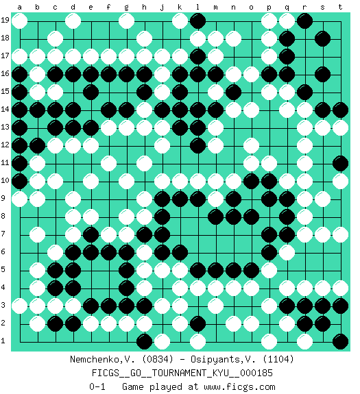 Last move : 0-1 2018 May 27 15:10:2 [Event "FICGS__GO__TOURNAMENT_KYU__000185"] [Site "FICGS"] [Date "2018.03.24"] [Round "1"] [Black "Nemchenko,Valery"] [White "Osipyants,Vladimir"] [Result "0-1"] [Rating 1 "0834"] [Rating 2 "1104"] 1.d4 q4 2.q16 d17 3.e15 c15 4.d14 g17 5.e16 e17 6.c14 b15 7.b14 d9 8.f16 j16 9.g16 h17 10.h16 j15 11.h15 k17 12.j14 d12 13.a15 b16 14.a13 c6 15.e6 k4 16.k6 o4 17.l5 l4 18.m5 m4 19.n5 n4 20.o5 p5 21.p6 q6 22.p7 n16 23.k15 r14 24.r15 q14 25.k16 j17 26.l14 q10 27.q8 o12 28.s14 s13 29.t14 t13 30.s16 c3 31.d5 d3 32.e3 e2 33.f3 f2 34.g3 m9 35.m8 o9 36.o8 p15 37.p16 o16 38.n9 n10 39.n8 m10 40.l9 h4 41.g4 h5 42.g5 h6 43.g6 h8 44.h7 g7 45.j7 f7 46.f6 d7 47.e7 e8 48.f8 g8 49.f9 h11 50.g9 h9 51.e9 d8 52.d10 g10 53.f10 f11 54.e11 e10 55.d13 e12 56.d11 c12 57.b12 b11 58.a11 b10 59.a10 a9 60.a12 b9 61.c13 r7 62.q7 r8 63.q9 r9 64.p10 p11 65.o10 o11 66.p9 n14 67.m14 m13 68.m16 m17 69.l17 l18 70.l16 n18 71.n15 o14 72.o15 m15 73.n15 p17 74.q17 p18 75.q18 q19 76.r19 p19 77.s18 g13 78.e13 f13 79.c11 c10 80.j8 l10 81.k9 h14 82.f14 j13 83.k14 j12 84.k13 k10 85.j9 j10 86.g14 h13 87.l13 m12 88.k18 f17 89.d16 c17 90.c16 b17 91.a16 a17 92.a14 k5 93.j6 j5 94.h3 j3 95.j2 k2 96.k1 h2 97.h1 g2 98.l2 k3 99.l3 n2 100.m2 m3 101.n1 o2 102.o1 p1 103.m1 l1 104.c5 b4 105.c4 b5 106.d6 b7 107.l19 m18 108.j18 h18 109.h19 g19 110.j19 k19 111.a18 q15 112.b18 c18 113.c19 d19 114.b19 a19 115.l2 j1 116.r3 r4 117.s3 s4 118.t3 q2 119.r2 s1 120.s2 r1 121.t1 t4 122.q3 p3 123.s11 r11 124.s10 s9 125.t9 r10 126.s12 r12 127.t12 r13 128.s8 t10 129.t11 t10 130.t8 s7 131.b3 b2 132.t11 t7 133.c2 a3 134.d2 b3 135.l12 pass 136.q1 r1 0-1 Here are the names of the openings (joseki) played in the four corners : Corner d16 : d17 e15 Komoku (Somok, Xiao~mu`) 3-4 Point. The komoku (3-4) point is the traditional corner enclosure move.. Corner d4 : d4 d9 Hoshi (Hwajeom, Seongjeom, Xingwei`) 4-4 Point. The star or hoshi (4-4) point, emphasizing influence at the potential expense of territory. Corner q16 : q16 n16 Hoshi (Hwajeom, Seongjeom, Xingwei`) 4-4 Point. The star or hoshi (4-4) point, emphasizing influence at the potential expense of territory. Niken Takagakari (Dukan Nop'dakeolch'im, E`r Gaojia, 2-Space High Approach). White 2 is a light approach move. Rarely played in even games, White 2 is typically employed in handicap games. Black continues with 6-4 or 3-10. In Korean Sunjang Baduk Black has a stone on 8-4. Player White won this Go (weiqi, baduk) game. Follow this game move after move (download)Learn to play under the stones. (Anonymous) In every real man a child is hidden that wants to play. (Friedrich Nietzsche)