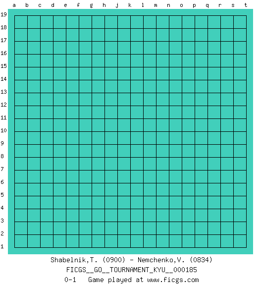 Last move : 0-1 2018 April 23 9:44:29 [Event "FICGS__GO__TOURNAMENT_KYU__000185"] [Site "FICGS"] [Date "2018.03.24"] [Round "1"] [Black "Shabelnik,Tanya"] [White "Nemchenko,Valery"] [Result "0-1"] [Rating 1 "0900"] [Rating 2 "0834"] 0-1 This go game has been lost on time (started : 2018.03.24 4:33:28) Here are the names of the openings (joseki) played in the four corners : Player White won this Go (weiqi, baduk) game. Follow this game move after move (download)Balance is not what players strike for, and if it does arise, it is in spite of them. (Pierre Audouard) An expert is a man who has made all the mistakes which can be made in a very narrow field. (Niels Bohr)