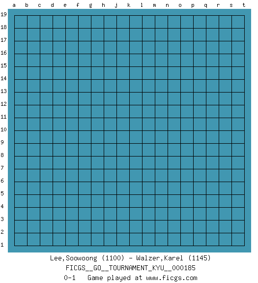 Last move : 0-1 2018 April 23 9:44:29 [Event "FICGS__GO__TOURNAMENT_KYU__000185"] [Site "FICGS"] [Date "2018.03.24"] [Round "1"] [Black "Lee,Soowoong"] [White "Walzer,Karel"] [Result "0-1"] [Rating 1 "1100"] [Rating 2 "1145"] 0-1 This go game has been lost on time (started : 2018.03.24 4:33:28) Here are the names of the openings (joseki) played in the four corners : Player White won this Go (weiqi, baduk) game. Follow this game move after move (download)Don't be greedy ! (Anonymous) Political correctness is subjecting us to gross incompetence. (Johann Piek)