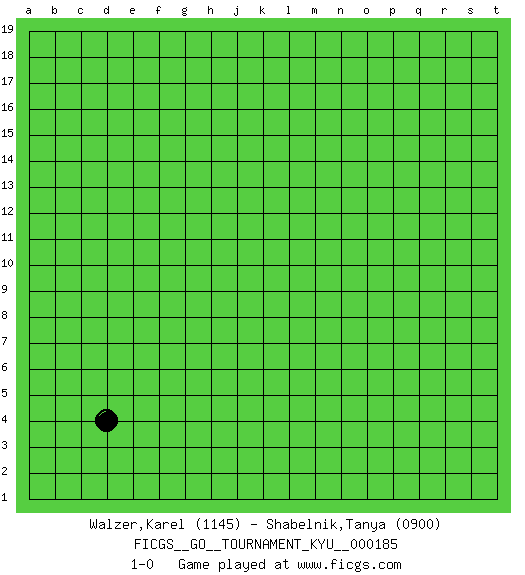 Last move : 1-0 2018 April 26 9:59:21 [Event "FICGS__GO__TOURNAMENT_KYU__000185"] [Site "FICGS"] [Date "2018.03.24"] [Round "1"] [Black "Walzer,Karel"] [White "Shabelnik,Tanya"] [Result "1-0"] [Rating 1 "1145"] [Rating 2 "0900"] 1.d4 1-0 This go game has been lost on time (started : 2018.03.24 4:33:28) Here are the names of the openings (joseki) played in the four corners : Corner d4 : d4 1-0 Hoshi (Hwajeom, Seongjeom, Xingwei`) 4-4 Point. The star or hoshi (4-4) point, emphasizing influence at the potential expense of territory. Player Black won this Go (weiqi, baduk) game. Follow this game move after move (download)Learn the eye-stealing tesuji. (Anonymous) Tomorrow's what you make of it. (Horatio Caine, C.S.I. Miami)