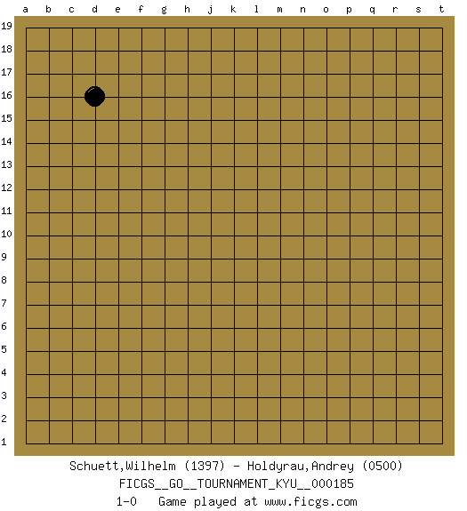 Last move : 1-0 2018 April 24 9:50:30 [Event "FICGS__GO__TOURNAMENT_KYU__000185"] [Site "FICGS"] [Date "2018.03.24"] [Round "1"] [Black "Schuett,Wilhelm"] [White "Holdyrau,Andrey"] [Result "1-0"] [Rating 1 "1397"] [Rating 2 "0500"] 1.d16 1-0 This go game has been lost on time (started : 2018.03.24 4:33:28) Here are the names of the openings (joseki) played in the four corners : Player Black won this Go (weiqi, baduk) game. Follow this game move after move (download)Corner, side, centre. (Anonymous) Beep ! (R2D2 in Star Wars ep.3)