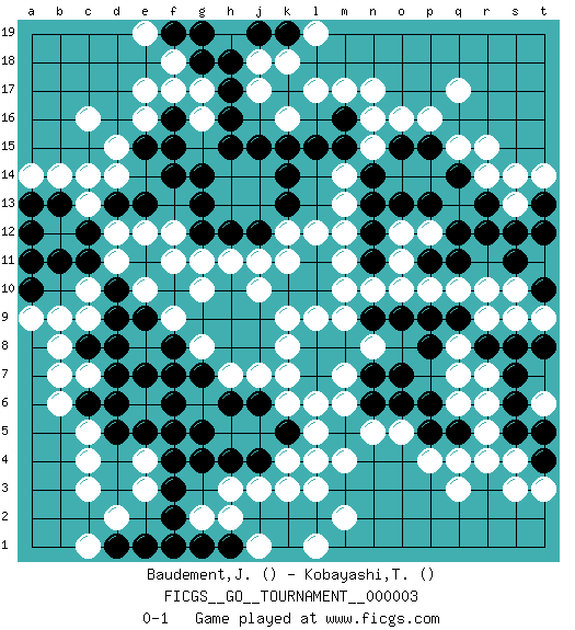 Last move : 0-1 2007 January 17 10:15:35 [Event "FICGS__GO__TOURNAMENT__000003"] [Site "FICGS"] [Date "2006.06.03"] [Round "1"] [Black "Baudement,Julien"] [White "Kobayashi,Tetsuya"] [Result "0-1"] 1.g14 q4 2.o13 e16 3.f7 c16 4.h16 q17 5.e13 c13 6.e11 k4 7.e9 n16 8.h18 e17 9.f5 k6 10.f3 c3 11.c11 c5 12.a11 b12 13.b11 d14 14.d10 b7 15.f1 d2 16.c12 q10 17.d13 c14 18.b13 b14 19.a12 k8 20.a13 a14 21.f14 m13 22.n14 m14 23.m15 n15 24.l15 m11 25.n13 n10 26.n12 m12 27.k14 q15 28.q12 r10 29.p13 r14 30.q11 p10 31.k10 l9 32.l10 m10 33.r12 q3 34.j8 j7 35.h8 k12 36.g7 k11 37.j9 h11 38.l11 l12 39.n11 o11 40.p11 o12 41.o7 q7 42.p8 o5 43.n6 n5 44.m5 m4 45.l5 l4 46.k5 j5 47.p6 q6 48.p5 p4 49.q5 r5 50.o6 q8 51.o9 o10 52.n9 m6 53.l7 l6 54.m8 m9 55.l8 k9 56.s11 s10 57.q9 r9 58.h4 j10 59.k2 m2 60.d7 l17 61.c8 b8 62.h6 b9 63.c6 b6 64.d5 c4 65.pass j3 66.f2 h2 67.j2 h3 68.h1 c9 69.d8 k18 70.m16 m17 71.j15 n17 72.j19 f12 73.f16 f18 74.g18 e12 75.j6 k7 76.h10 g10 77.h9 d12 78.g12 g11 79.g13 f11 80.h12 d11 81.j12 j11 82.g4 c10 83.t10 t9 84.d1 c1 85.e1 e10 86.d9 e6 87.f6 h5 88.g5 h7 89.e7 g8 90.g9 f9 91.f8 e4 92.e5 c7 93.d6 j17 94.h17 f17 95.f15 g17 96.e15 g16 97.h15 d15 98.k13 k16 99.k15 g2 100.j4 k3 101.g19 j18 102.k19 l19 103.f19 e19 104.o15 o16 105.p15 p16 106.q14 r15 107.r13 s13 108.k5 l5 109.l2 l3 110.s12 s14 111.t13 t14 112.t12 l1 113.k1 j1 114.g1 e3 115.f4 p12 116.a10 a9 117.s8 s9 118.p9 n8 119.n7 m7 120.r8 r7 121.s7 r4 122.s6 r6 123.s5 s4 124.t4 t3 125.t5 s3 126.t8 t6 0-1 Here are the names of the openings (joseki) played in the four corners : Corner d16 : g14 e16 This joseki is unknown. A weak or weird move has probably been played in this corner. Corner q16 : o13 q17 This joseki is unknown. A weak or weird move has probably been played in this corner. Player White won this Go (weiqi, baduk) game. Follow this game move after move (download)Beware of the clumsy double contact. (Anonymous) Don't anthropomorphize computers - they hate it. (Anonymous)