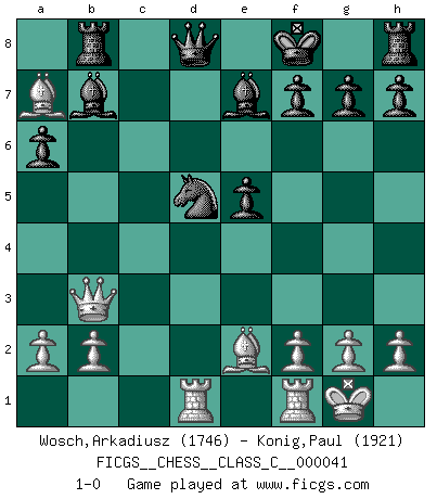 Last move : 1-0 2007 August 15 22:34:14 [Event "FICGS__CHESS__CLASS_C__000041"] [Site "FICGS"] [Date "2007.05.01"] [Round "1"] [White "Wosch,Arkadiusz"] [Black "Konig,Paul"] [Result "1-0"] [WhiteElo "1746"] [BlackElo "1921"] 1.e4 c5 2.Nf3 Nc6 3.d4 cxd4 4.Nxd4 e5 5.Nb5 d6 6.N1c3 a6 7.Na3 b5 8.Nd5 Nce7 9.c4 Nxd5 10.exd5 bxc4 11.Nxc4 Nf6 12.Be3 Rb8 13.Be2 Bb7 14.Nb6 Be7 15.Qa4+ Kf8 16.Rd1 Qe8 17.Qa3 Qd8 18.O-O Nd7 19.Nc4 Nf6 20.Nxe5 Nxd5 21.Qb3 dxe5 22.Ba7 1-0 Sicilian : Labourdonnais-Loewenthal (Kalashnikov) variation Kingside Castling by player White (move 18) Player White won this chess game. Follow this game move after move (download)When the Chess game is over, the Pawn and the King go back to the same box. (Irish saying) Garry Kasparov war erst in der Großmeister-Organisation GMA, dann in der Profischach-Vereinigung PCA, zum Schluss kehrte er wieder in den Schoß der FIDE zurück. Aber gut, manche Leute sind flexibel (Viswanathan Anand) Repentinamente, me resultaba obvio en mi analisis que yo había pasado por alto lo que Fischer había visto en el tablero con la mas grande facilidad. (Mikhail Botvinnik) Je ne suis pas le dernier à jouer lâchement des coups douteux pendant le zeïtnot de l'adversaire pour l'achever: en effet les coups qui font le plus peur sont ceux que l'on ne comprend pas. Je me fais souvent peur quand je joue. (Un professeur anonyme) I believe in luck. How else can you explain the success of those you dislike ? (Jean Cocteau)
