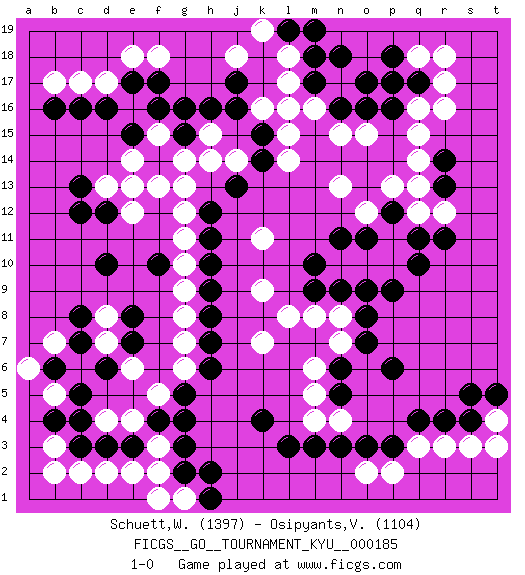 Last move : 1-0 2018 July 23 12:6:11 [Event "FICGS__GO__TOURNAMENT_KYU__000185"] [Site "FICGS"] [Date "2018.03.24"] [Round "1"] [Black "Schuett,Wilhelm"] [White "Osipyants,Vladimir"] [Result "1-0"] [Rating 1 "1397"] [Rating 2 "1104"] 1.d16 d4 2.q4 r16 3.o17 l16 4.m17 l17 5.q17 r17 6.r14 q15 7.p16 q14 8.r13 q13 9.r11 n13 10.d10 c6 11.k4 n4 12.m3 m4 13.l3 r3 14.r4 q3 15.p3 p2 16.o3 o2 17.n3 n7 18.p6 s3 19.n6 m6 20.n5 m5 21.o7 n8 22.o8 k7 23.j17 l14 24.m18 l18 25.h16 c17 26.c16 d17 27.e17 e18 28.f17 f18 29.b16 b17 30.g3 f3 31.g2 f2 32.c8 e13 33.d12 d13 34.c13 e12 35.c12 h14 36.f14 g13 37.f10 g11 38.k15 l15 39.h9 k9 40.h11 g10 41.h10 g9 42.h8 g8 43.h7 g7 44.h6 g6 45.h12 g12 46.j13 j14 47.k14 m16 48.n16 n15 49.g5 f5 50.f4 e4 51.g4 e6 52.n9 m8 53.n11 p11 54.q10 p10 55.p9 o10 56.o9 n10 57.m9 l8 58.m10 k11 59.p12 o12 60.o11 q12 61.q11 p13 62.s4 t4 63.t5 t3 64.s5 q18 65.p18 q16 66.p17 r18 67.l19 k19 68.m19 j18 69.n18 o15 70.o16 g1 71.h1 f1 72.h2 e14 73.e3 e2 74.d3 d2 75.c3 c2 76.c4 b3 77.b4 b2 78.b6 b7 79.c7 b5 80.c5 a6 81.d6 d7 82.b6 r12 83.e7 d8 84.e8 f15 85.g15 g14 86.e15 f13 87.f16 h15 88.g16 k16 89.j16 1-0 Here are the names of the openings (joseki) played in the four corners : Corner q16 : r16 o17 Komoku (Somok, Xiao~mu`) 3-4 Point. The komoku (3-4) point is the traditional corner enclosure move.. Niken Kakari (Dukan Keolch'im, E`r Gua`jiao~, 2-Space Low Approach). Black 2 is used with friendly forces backing it up. Its purpose is to prevent a pincer. Locally it results in a loss, but may be appropriate fuseki strategy. It was popular in the late 1950s and early 1960s, but is not seen often nowadays, having been replaced by the one-space high approach, with which it has points in common. Corner q4 : q4 n4 Hoshi (Hwajeom, Seongjeom, Xingwei`) 4-4 Point. The star or hoshi (4-4) point, emphasizing influence at the potential expense of territory. Niken Takagakari (Dukan Nop'dakeolch'im, E`r Gaojia, 2-Space High Approach). White 2 is a light approach move. Rarely played in even games, White 2 is typically employed in handicap games. Black continues with 6-4 or 3-10. In Korean Sunjang Baduk Black has a stone on 8-4. Player Black won this Go (weiqi, baduk) game. Follow this game move after move (download)Don't make dango's. (Anonymous) Vladimir Ras-Putin is still alive... He is also a good actor, I saw him in the Lord of the Rings. (Rodolfo d'Ettorre)