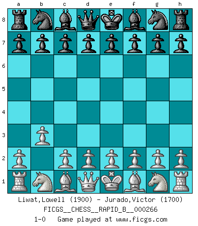 Last move : 1-0 2018 April 24 9:50:30 [Event "FICGS__CHESS__RAPID_B__000266"] [Site "FICGS"] [Date "2018.03.25"] [Round "1"] [White "Liwat,Lowell"] [Black "Jurado,Victor"] [Result "1-0"] [WhiteElo "1900"] [BlackElo "1700"] 1.b3 1-0 This chess game has been lost on time (started : 2018.03.25 1:6:11) Nimzovich-Larsen attack Player White won this chess game. Follow this game move after move (download)It is peculiar but a fact nevertheless, that gamblers in chess always have enthusiastic followers. (Botvinnik) Ich hatte meine größten Erfolge, als ich 47 Jahre alt war. Kasparow war noch nicht mal 42 und hat das Schach schon im Stich gelassen. (Viktor Kortschnoi) Los tropiezos estan todos ahí en el tablero, esperando que se cometan. (Savielly Tartakover) Nous vivons dans un monde échiquéen : chaque jour qui passe est un défi à relever. (Philosophe Sasha) Everybody lies. (Gregory House, House M.D.)