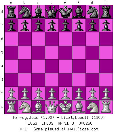 Last move : 0-1 2018 April 24 9:50:30 [Event "FICGS__CHESS__RAPID_B__000266"] [Site "FICGS"] [Date "2018.03.25"] [Round "1"] [White "Harvey,Jose"] [Black "Liwat,Lowell"] [Result "0-1"] [WhiteElo "1700"] [BlackElo "1900"] 0-1 This chess game has been lost on time (started : 2018.03.25 1:6:11) Player Black won this chess game. Follow this game move after move (download)Adequate compensation for a sacrifice is having a sound combination leading to a winning position; adequate compensation for a blunder is having your opponent snatch defeat from the jaws of victory. (Bruce A. Moon) Über die Verhaftung Bobby Fischers: Warum es die Bush-Administration für nötig befindet einen 61 Jahre alten Mann zu hetzten, der für niemanden ausser sich selbste eine Gefahr darstellt ist ein Rätsel. (Nigel Short) Un buen sacrificio es aquel que aunque no sea necesariamente sólido, deja a tu oponente aturdido y confuso. (Rudolph Spielmann) Tout change constamment, y compris dans le monde des Echecs. (Botvinnik) A person who never made a mistake never tried anything new. (Albert Einstein)
