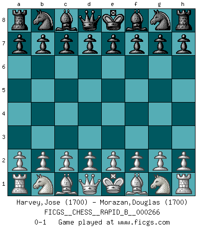 Last move : 0-1 2018 April 24 9:50:30 [Event "FICGS__CHESS__RAPID_B__000266"] [Site "FICGS"] [Date "2018.03.25"] [Round "1"] [White "Harvey,Jose"] [Black "Morazan,Douglas"] [Result "0-1"] [WhiteElo "1700"] [BlackElo "1700"] 0-1 This chess game has been lost on time (started : 2018.03.25 1:6:11) Player Black won this chess game. Follow this game move after move (download)When you absolutely don't know what to do anymore, it is time to panic. (John van der Wiel) Der Vorposten provoziert a) eine Basis für neue Angriffe und b) eine Schwächung der gegnerischen Widerstandskraft in der fraglichen Linie. (Aaron Nimzowitsch) Todos los jugadores de Ajedrez deberían tener un pasatiempo. (Savielly Tartakower) Mais l'homme est une créature légère et illogique : semblable au joueur d'échecs, il n'aime que le processus du but à atteindre, non le but lui-même. (Dostoïevsky) Fortune favours the audacious. (Desiderius Erasmus)
