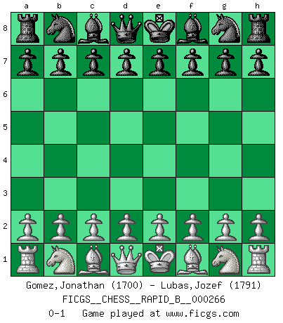 Last move : 0-1 2018 April 24 9:50:30 [Event "FICGS__CHESS__RAPID_B__000266"] [Site "FICGS"] [Date "2018.03.25"] [Round "1"] [White "Gomez,Jonathan"] [Black "Lubas,Jozef"] [Result "0-1"] [WhiteElo "1700"] [BlackElo "1791"] 0-1 This chess game has been lost on time (started : 2018.03.25 1:6:11) Player Black won this chess game. Follow this game move after move (download)If I win a tournament, I win it by myself. I do the playing. Nobody helps me. (Bobby Fischer) Alle offensichtlichen Züge sehen nach dem Spiel in der Analyse verdächtig aus. (Viktor Kortschnoi) Los libros de Ajedrez deben de usarse igual como usamos los anteojos: para mejorar la vista, aunque algunos jugadores los quieren usar como si ellos les otorgaran la vision. (José Raúl Capablanca) Le jeu d'échecs est comme rejeté hors du temps. (Antoine de Saint-Exupéry) Programming can only do so much before it becomes too much. (Don Groves)