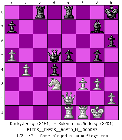 Last move : 1/2-1/2 2018 May 29 17:19:46 [Event "FICGS__CHESS__RAPID_M__000092"] [Site "FICGS"] [Date "2018.03.26"] [Round "1"] [White "Dusk,Jerzy"] [Black "Bakhmatov,Andrey"] [Result "1/2-1/2"] [WhiteElo "2151"] [BlackElo "2201"] 1.d4 Nf6 2.c4 g6 3.g3 Bg7 4.Bg2 O-O 5.Nc3 d6 6.Nf3 Nc6 7.O-O e5 8.d5 Ne7 9.e4 Nd7 10.Ne1 f5 11.Nd3 h6 12.Bd2 g5 13.exf5 Nxf5 14.Ne4 Nf6 15.Bc3 Bd7 16.Qd2 Nxe4 17.Bxe4 c5 18.dxc6 Bxc6 19.Bxc6 bxc6 20.Rae1 c5 21.b4 Nd4 22.Bxd4 cxd4 23.c5 Re8 24.f3 Rc8 25.a4 Kh8 26.a5 Qd7 27.cxd6 Qxd6 28.Qe2 Qd5 1/2-1/2 King's Indian : 3.g3 Kingside Castling by player Black (move 4) Kingside Castling by player White (move 7) This chess game ended in a draw. Follow this game move after move (download)Some part of a mistake is always correct. (Savielly Tartakover) Der Traum, für den ich lebe, ist der von einem freien Russland. Viele mögen sagen: Russland hat doch ein Parlament, einen gewählten Präsidenten. Aber ich spüre, dass in meiner Heimat die Angst wiederkehrt. Eine Angst, sich frei zu äußern, bestimmte Dinge zu tun (Garry Kasparov) Con el fin de mejorar tu juego, debes de estudiar los finales antes que todo, ya que mientras que los finales pueden ser estudiados y dominados por sí mismos, el juegomedio y la apertura deben de ser estudiados en relación con los finales. (José Raúl Capablanca) Les Echecs sont et restent toujours un combat, un combat intégral comme la boxe, la lutte ou un autre sport, et où il doit y avoir un vainqueur et un vaincu. (Joseph Emil Diemer) The obstacle is the path. (Zen proverb)