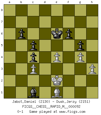 Last move : 0-1 2018 July 3 21:13:54 [Event "FICGS__CHESS__RAPID_M__000092"] [Site "FICGS"] [Date "2018.03.26"] [Round "1"] [White "Jabot,Daniel"] [Black "Dusk,Jerzy"] [Result "0-1"] [WhiteElo "2130"] [BlackElo "2151"] 1.e4 e5 2.Nf3 Nc6 3.Bb5 Nf6 4.O-O Nxe4 5.d4 Nd6 6.Bxc6 dxc6 7.dxe5 Nf5 8.Qe2 Nd4 9.Nxd4 Qxd4 10.Rd1 Qg4 11.f3 Qg6 12.Be3 Bf5 13.c3 Be7 14.Qf2 b6 15.Nd2 O-O-O 16.Nf1 h5 17.a4 h4 18.a5 Rxd1 19.Rxd1 Rd8 20.Rxd8+ Bxd8 21.g4 Bd3 22.h3 Ba6 23.Nd2 Qc2 24.axb6 axb6 25.Ne4 Qb1+ 26.Kg2 Bd3 27.Ng5 Bc4 28.Bf4 Be7 29.Be3 Bd5 30.Kh2 Qg6 31.Ne4 Qe6 32.Kg1 Bxe4 33.fxe4 Kb7 34.Bd4 c5 35.Be3 Qxe5 36.Qf4 Qxf4 37.Bxf4 g5 38.Bd2 c4 39.Kf2 Kc6 40.Ke2 Kd6 41.Ke3 Ke5 42.Kf3 f6 43.Be3 Bd6 44.Bg1 Ke6 45.Be3 Be5 46.Bd2 c5 47.Be1 Bf4 48.Bxh4 Bc1 49.Be1 Bxb2 50.Ke2 Bc1 0-1 Ruy Lopez : Berlin defense, Open variation Kingside Castling by player White (move 4) Queenside Castling by player Black (move 15) Player Black won this chess game. Follow this game move after move (download)Examine moves that smite! A good eye for smites is far more important than a knowledge of strategical principles. (Purdy) Ich organisiere ein großes Turnier, was mich etwa 120000 Dollar kostet. Ich denke, das ist das erste Mal in der Schachgeschichte, daß ein Schachgroßmeister auch als Mäzen auftritt. (Miguel Najdorf) Una compensación adecuada por un sacrificio es tener una combinación sólida que conduce a una posición ganadora; una compensación adecuada por una metida de pata es dejar a tu oponente arrebatar una derrota de las fauces de la victoria. (Bruce A. Moon) J'ai toujours senti une vague pitié pour l'homme qui ne connaît rien aux échecs, tout comme j'en aurais pour un homme ignorant de l'amour. Les Echecs, comme la musique ou comme l'amour, ont le pouvoir de rendre heureux. (Siegbert Tarrasch) As a goal marker shodan is important. As a destination it is a poor place to stop. (Thomas Tamayo)
