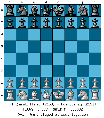 Last move : 0-1 2018 April 25 9:54:13 [Event "FICGS__CHESS__RAPID_M__000092"] [Site "FICGS"] [Date "2018.03.26"] [Round "1"] [White "Al ghamdi,Ahmed"] [Black "Dusk,Jerzy"] [Result "0-1"] [WhiteElo "2159"] [BlackElo "2151"] 0-1 This chess game has been lost on time (started : 2018.03.26 2:30:48) Player Black won this chess game. Follow this game move after move (download)You need not play well - just help your opponent to play badly. (Genrikh Chepukaitis) Wenn man heute mit 14 Jahren noch kein GM ist, kann man es vergessen. (Viswanathan Anand) A través de las casillas del tablero, los Indios explican el movimiento del tiempo y la edad, las influencias mas altas que controlan el mundo y los lazos que vinculan al Ajedrez con el alma humana. (Al-Masudi) Les sacrifices démontrent seulement que quelqu'un a gaffé. (Savielly Tartacover) You can't play chess if you're groggy from pills. (Anatoly Karpov)
