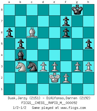 Last move : 1/2-1/2 2018 June 3 17:23:18 [Event "FICGS__CHESS__RAPID_M__000092"] [Site "FICGS"] [Date "2018.03.26"] [Round "1"] [White "Dusk,Jerzy"] [Black "DiAlfonso,Darren"] [Result "1/2-1/2"] [WhiteElo "2151"] [BlackElo "2192"] 1.Nf3 d5 2.g3 Nf6 3.Bg2 c6 4.O-O Bf5 5.c4 e6 6.cxd5 exd5 7.d3 Bc5 8.Qc2 Na6 9.a3 O-O 10.b4 Be7 11.Bb2 c5 12.bxc5 Nxc5 13.Rc1 Rc8 14.Qd1 b5 15.Nd4 Qd7 16.Nd2 Bg4 17.N2f3 Bxf3 18.Nxf3 Na4 19.Bd4 a6 20.e3 h5 21.Qb3 Nc5 22.Qd1 Na4 23.Ne1 Rxc1 24.Qxc1 Rc8 25.Qd1 Rc6 26.Nf3 Qc8 27.h3 Bxa3 28.Bxf6 gxf6 29.Nd4 Rc1 30.Rxc1 Qxc1 31.Qxc1 Bxc1 32.Nb3 Ba3 33.Bxd5 Bb4 34.Kf1 Nc3 35.Bc6 Na2 36.Ke2 Nc3+ 1/2-1/2 Reti : King's Indian attack (Barcza system) Kingside Castling by player White (move 4) Kingside Castling by player Black (move 9) This chess game ended in a draw. Follow this game move after move (download)In Chess, just as in life, today's bliss may be tomorrow's poison. (Assaic) Ich las kürzlich ein Buch von Nietzsche. Er sagte Religion verdumme nur die Menschen. Ich stimme zu. (Robert James Fischer) En posiciones complicadas, Bobby Fischer pocas veces tuvo que temer de cualquiera. (Paul Keres) Votre prénom est 'Tactique', votre deuxième prénom est 'Tactique' et votre nom est 'Tactique'. (Ken Smith) When I took office, only high energy physicists had ever heard of what is called the World Wide Web... Now even my cat has its own page. (Bill Clinton, 1996)