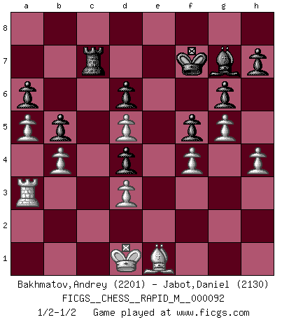 Last move : 1/2-1/2 2018 July 18 1:48:40 [Event "FICGS__CHESS__RAPID_M__000092"] [Site "FICGS"] [Date "2018.03.26"] [Round "1"] [White "Bakhmatov,Andrey"] [Black "Jabot,Daniel"] [Result "1/2-1/2"] [WhiteElo "2201"] [BlackElo "2130"] 1.e4 e5 2.Nf3 Nc6 3.Bb5 a6 4.Ba4 Nf6 5.O-O Be7 6.d3 b5 7.Bb3 d6 8.Bd2 O-O 9.h3 Bb7 10.Re1 Nd7 11.Bd5 Nf6 12.Bb3 Nd7 13.a3 Kh8 14.Nc3 Nc5 15.Ba2 Ne6 16.Ne2 Ncd4 17.Nexd4 Nxd4 18.Nxd4 exd4 19.Qh5 Kg8 20.f4 c5 21.Re2 Rc8 22.Bd5 Qb6 23.Rf1 Bxd5 24.Qxd5 Rfe8 25.g4 c4 26.b4 Qc6 27.g5 Qxd5 28.exd5 f6 29.h4 g6 30.Kg2 f5 31.Kf3 cxd3 32.cxd3 Rc2 33.a4 Ra2 34.a5 Rc8 35.Bc1 R8c2 36.Rxc2 Rxc2 37.Rd1 Bf8 38.Bd2 Rc7 39.Rh1 Kf7 40.Ke2 Bg7 41.Kd1 Rc8 42.Rh2 Bf8 43.Be1 Rc7 44.Re2 Rc8 45.Ra2 Bg7 46.Ra3 Rc7 1/2-1/2 Ruy Lopez : Closed defense Kingside Castling by player White (move 5) Kingside Castling by player Black (move 8) This chess game ended in a draw. Follow this game move after move (download)He who takes the Queen's Knight's Pawn will sleep in the streets. (Anonymous) Die Neutralität betrachte ich als eine schwere Krankheit. (Viktor Kortschnoi) La única cosa que los jugadores de Ajedrez tienen en común, es el Ajedrez. (Lodewijk Prins) Mais l'homme est une créature légère et illogique : semblable au joueur d'échecs, il n'aime que le processus du but à atteindre, non le but lui-même. (Dostoïevsky) It is not true that people stop pursuing dreams because they grow old, they grow old because they stop pursuing dreams. (Gabriel Garcia Marquez)