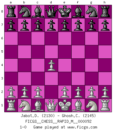 Last move : 1-0 2018 April 25 21:57:53 [Event "FICGS__CHESS__RAPID_M__000092"] [Site "FICGS"] [Date "2018.03.26"] [Round "1"] [White "Jabot,Daniel"] [Black "Ghosh,Chanchal Kumer"] [Result "1-0"] [WhiteElo "2130"] [BlackElo "2145"] 1.d4 1-0 This chess game has been lost on time (started : 2018.03.26 2:30:48) Queen's pawn Player White won this chess game. Follow this game move after move (download)The passed Pawn is a criminal, who should be kept under lock and key. Mild measures, such as police surveillance, are not sufficient. (Aaron Nimzovich) Der vorletzte Fehler gewinnt. (Savielly Grigorievitsch Tartakower) No soy una persona materialista y por eso, no resiento la falta o pérdida del dinero. La ausencia de cosas mundanas carece de importancia. Ya que el Ajedrez es una forma en la que puedo ser tan materialista como yo desee sin tener la necesidad de vender mi alma. (Jamie Walter Adams) A ce moment-là, je menaçais de comprendre la position ! (Clément L'Heureux) I live to kill Traxler counterattack. (Ilmars Cirulis)