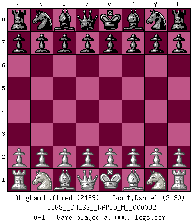 Last move : 0-1 2018 April 25 9:54:13 [Event "FICGS__CHESS__RAPID_M__000092"] [Site "FICGS"] [Date "2018.03.26"] [Round "1"] [White "Al ghamdi,Ahmed"] [Black "Jabot,Daniel"] [Result "0-1"] [WhiteElo "2159"] [BlackElo "2130"] 0-1 This chess game has been lost on time (started : 2018.03.26 2:30:48) Player Black won this chess game. Follow this game move after move (download)We must make sure that Chess will not be like a dead language, very interesting, but for a very small group. (Sytze Faber) Ja, jede Frau in Holland liebt mich bestimmt, und alle Männer hassen mich. (Loek van Wely) Jugadores de primera clase pierden en contra de jugadores de segunda clase porque los jugadores de segunda clase a veces juegan una partida de primer clase. (Siegbert Tarrasch) Les erreurs sont comme les malheurs, elles n'arrivent jamais seules. (Siegbert Tarrasch) Computer Science is no more about computers than astronomy is about telescopes. (Edsger W. Dijkstra)