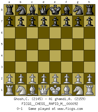 Last move : 0-1 2018 April 25 9:54:13 [Event "FICGS__CHESS__RAPID_M__000092"] [Site "FICGS"] [Date "2018.03.26"] [Round "1"] [White "Ghosh,Chanchal Kumer"] [Black "Al ghamdi,Ahmed"] [Result "0-1"] [WhiteElo "2145"] [BlackElo "2159"] 0-1 This chess game has been lost on time (started : 2018.03.26 2:30:48) Player Black won this chess game. Follow this game move after move (download)There just isn't enough televised Chess. (David Letterman) Kein Großmeister ist normal. Sie unterscheiden sich nur im Ausmaß Ihrer Verrücktheit. (Viktor Kortschnoi) La táctica fluye a partir de una posición superior. (Bobby Fischer) Demandez au pauvre Cg1 ce qu'il en pense. Eduard Gufeld à propos de la variante Saemisch de l'Est-Indienne. Your best chance to get a Royal Flush in a casino is in the bathroom. (Anonymous)