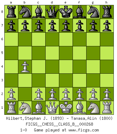 Last move : 1-0 2018 June 10 14:9:44 [Event "FICGS__CHESS__CLASS_B__000268"] [Site "FICGS"] [Date "2018.03.26"] [Round "1"] [White "Hilbert,Stephan J."] [Black "Tanasa,Alin"] [Result "1-0"] [WhiteElo "1893"] [BlackElo "1800"] 1.b4 1-0 This chess game has been lost on time (started : 2018.03.26 4:25:38) Polish (Sokolsky) opening Player White won this chess game. Follow this game move after move (download)One doesn't have to play well, it's enough to play better than your opponent. (Siegbert Tarrasch) Es war undenkbar für die Behörden, dass ein sowjetischer Großmeister auf diese Art und Weise [Fischer-Taimanov 6:0] verliert, ohne dass es eine politischer Erklärung dafür gäbe. (Mark Taimanov) Yo considero que Fischer es uno de los expertos mas grandes de aperturas de siempre. (Keith Hayward) Ne tendez aucun piège pour le plaisir ! Ne jouez rien dans l'espoir que l'adversaire réagisse de façon stupide ! Prenez toujours pour acquis que l'adversaire va trouver le meilleur coup ! Ne jouez jamais de coup dans l'espoir que l'adversaire ne voie pas la menace ! Chacun de vos coups doit améliorer la position d'une façon ou d'une autre. It is a good thing for an uneducated man to read books of quotations. (Winston Churchill)