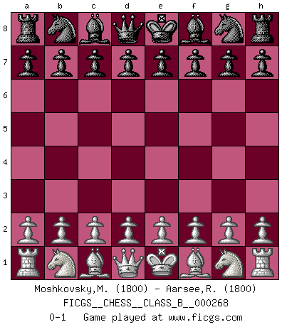 Last move : 0-1 2018 May 5 10:37:51 [Event "FICGS__CHESS__CLASS_B__000268"] [Site "FICGS"] [Date "2018.03.26"] [Round "1"] [White "Moshkovsky,Maxim"] [Black "Aarsee,Ramchandanbapu"] [Result "0-1"] [WhiteElo "1800"] [BlackElo "1800"] 0-1 This chess game has been lost on time (started : 2018.03.26 4:25:38) Player Black won this chess game. Follow this game move after move (download)Pawn endings are to Chess what putting is to golf. (Cecil Purdy) Fischer: 'Remis!?' Uhlmann: 'Aber es muss doch dreimal Zugwiederholung sein!' Fischer: 'Sie nehmen das Remis an, wie ich es sage, sonst spiele ich weiter und werde Sie dann schlagen!' (Robert James Fischer) El Ajedrez es despiadado: debes de estar preparado para matar gente. (Nigel Short) Si le désir cupide (et stupide) de gagner est une inépuisable source de souffrance, une combinaison brillante sur l'échiquier est une découverte : le coquelicot qui s'épanouit lorsque apparaît la Voie Lactée. (Arrabal) Luck never gives; it only lends. (Swedish proverb)