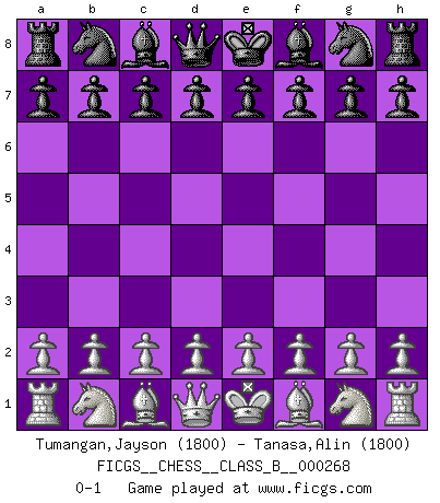 Last move : 0-1 2018 May 5 10:37:51 [Event "FICGS__CHESS__CLASS_B__000268"] [Site "FICGS"] [Date "2018.03.26"] [Round "1"] [White "Tumangan,Jayson"] [Black "Tanasa,Alin"] [Result "0-1"] [WhiteElo "1800"] [BlackElo "1800"] 0-1 This chess game has been lost on time (started : 2018.03.26 4:25:38) Player Black won this chess game. Follow this game move after move (download)The older I grow, the more I value pawns. (Paul Keres) Ich habe kein Problem mit Frauen, sondern nur mit dem Niveau ihres Schachspiels (Judith Polgar) Creo que una cierta cantidad de temperamento es esperada de los genios del Ajedrez. (Ron Gross) La victoire dans une partie d'Echecs appartient la plupart du temps à celui qui voit un peu plus loin que l'adversaire. (Lasker) Luck has a peculiar habit of favoring those who don't depend on it. (Author unknown)