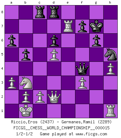 Last move : 1/2-1/2 2018 June 9 0:29:4 [Event "FICGS__CHESS__WORLD_CHAMPIONSHIP__000015"] [Site "FICGS"] [Date "2018.03.26"] [Round "1"] [White "Riccio,Eros"] [Black "Germanes,Ramil"] [Result "1/2-1/2"] [WhiteElo "2437"] [BlackElo "2289"] 1.e4 c5 2.Nf3 d6 3.d4 cxd4 4.Nxd4 Nf6 5.Nc3 a6 6.Nb3 g6 7.Be3 Bg7 8.f3 O-O 9.Qd2 Nc6 10.O-O-O Be6 11.Kb1 Ne5 12.Be2 Rc8 13.g4 Qc7 14.h4 Rfd8 15.Bd4 b5 16.a3 h5 17.gxh5 Nxh5 18.Nd5 Bxd5 19.exd5 Nc4 20.Bxc4 Qxc4 21.Bxg7 Kxg7 22.Rde1 Qf4 23.Rxe7 1/2-1/2 Sicilian : Najdorf Kingside Castling by player Black (move 8) Queenside Castling by player White (move 10) This chess game ended in a draw. Follow this game move after move (download)I don't believe in psychology. I believe in good moves. (Bobby Fischer) Schachspieler können ausgezeichnet Varianten am Schachbrett berechnen, aber nicht im realen Leben. Zu stark ist der Individualismus im Schach ausgeprägt, und für viele ist ein kleiner momentaner persönlicher Vorteil wichtiger als ein weit größerer Vorteil von morgen. (Anatoly Karpov) Coloca el contenido de las piezas del Ajedrez en un sombrero, agitalo vigorosamente, arrojalas en un tablero desde una altura de 30 centimetros y así obtendras el estilo de Steinitz. (H. E. Bird) Seul un grand joueur sait à quel point il joue faiblement. (Xavier Tartacover) Never risk one's whole fortune unless supported by one's entire army. (Niccolo Machiavelli)