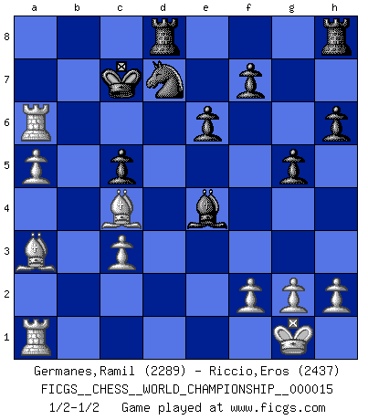 Last move : 1/2-1/2 2018 June 7 15:14:11 [Event "FICGS__CHESS__WORLD_CHAMPIONSHIP__000015"] [Site "FICGS"] [Date "2018.03.26"] [Round "4"] [White "Germanes,Ramil"] [Black "Riccio,Eros"] [Result "1/2-1/2"] [WhiteElo "2289"] [BlackElo "2437"] 1.d4 d5 2.c4 e6 3.Nc3 c6 4.Nf3 Nf6 5.Bg5 h6 6.Bh4 dxc4 7.e4 g5 8.Bg3 b5 9.Be2 Bb7 10.O-O Nbd7 11.Ne5 Bg7 12.Nxd7 Nxd7 13.Bd6 a6 14.a4 b4 15.Bxb4 Qb6 16.Ba3 Qxd4 17.a5 Qxd1 18.Rfxd1 c5 19.Bxc4 Bxc3 20.bxc3 Bxe4 21.Rd6 O-O-O 22.Rxa6 Kc7 23.Ra7+ Kb8 24.Ra6 Kc7 1/2-1/2 QGD : Semi-Slav Kingside Castling by player White (move 10) Queenside Castling by player Black (move 21) This chess game ended in a draw. Follow this game move after move (download)If a ruler does not understand Chess, how can he rule over a kingdom ? (King Khusros II) Wie kann ich Remis annehmen? Ich weiß ja gar nicht, wie ich stehe! (Fritz Sämisch) El Ajedrez es el juego mas altamente simbólico, pero las agresiones estan por lo tanto aún mas francamente representadas en la partida. Tal vez comenzo como un juego de guerra; Algo como la representación de una batalla en miniatura entre las fuerzas de dos reinos. (Karl Meninger) Dans le domaine de la peinture, de la gravure et de la sculpture, dès la première décennie de notre siècle, les artistes abandonnent la représentation de la partie d'échecs pour se concentrer sur les pièces, sur les échiquiers et sur toutes les variations auxquelles les unes et les autres peuvent donner lieu. On passe en quelque sorte d'un thème social à un thème musical (au sens de la musica médiévale, c'est-à-dire d'une notion qui inclue le rythme, l'harmonie, la construction et la déconstruction, etc.). Graphiquement et picturalement, l'échiquier apparaît comme une structure ouverte, dynamique, d'une richesse infinie, autorisant toutes les combinatoires et débouchant sur des mouvements et des rythmes de nature exponentielle. (Michel Pastoureau) There are 10 types of people in this world: those who understand binary and those who don't. (Anonymous)