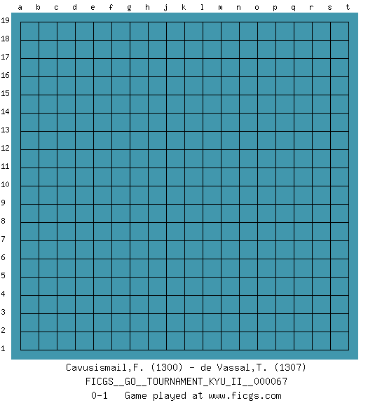 Last move : 0-1 2018 April 26 21:58:24 [Event "FICGS__GO__TOURNAMENT_KYU_II__000067"] [Site "FICGS"] [Date "2018.03.27"] [Round "1"] [Black "Cavusismail,Furkan"] [White "de Vassal,Thibault"] [Result "0-1"] [Rating 1 "1300"] [Rating 2 "1307"] 0-1 This go game has been lost on time (started : 2018.03.27 12:43:29) Here are the names of the openings (joseki) played in the four corners : Player White won this Go (weiqi, baduk) game. Follow this game move after move (download)Play slow, win slow; play fast, lose fast. (Anonymous) Whenever people agree with me, I always feel I must be wrong. (Oscar Wilde)