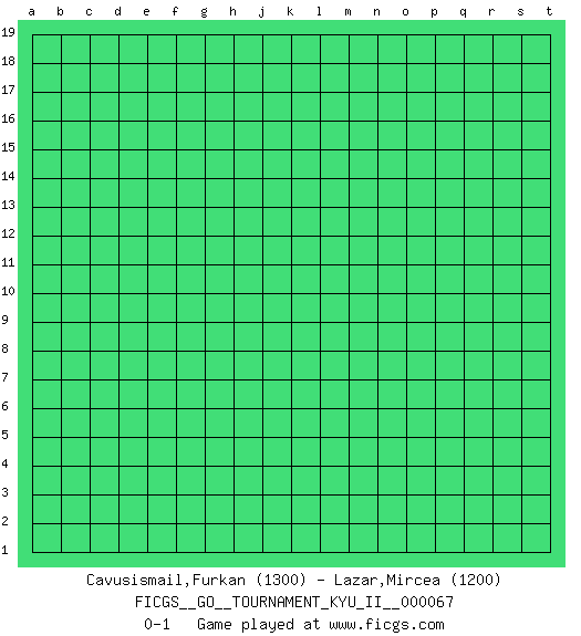 Last move : 0-1 2018 April 26 21:58:24 [Event "FICGS__GO__TOURNAMENT_KYU_II__000067"] [Site "FICGS"] [Date "2018.03.27"] [Round "1"] [Black "Cavusismail,Furkan"] [White "Lazar,Mircea"] [Result "0-1"] [Rating 1 "1300"] [Rating 2 "1200"] 0-1 This go game has been lost on time (started : 2018.03.27 12:43:29) Here are the names of the openings (joseki) played in the four corners : Player White won this Go (weiqi, baduk) game. Follow this game move after move (download)Don't make a play adjacent to a cutting-point. (Anonymous) Don't anthropomorphize computers - they hate it. (Anonymous)