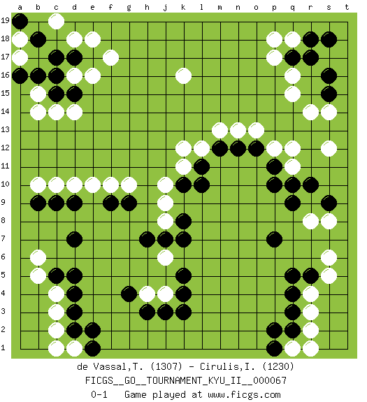 Last move : 0-1 2018 June 21 20:48:36 [Event "FICGS__GO__TOURNAMENT_KYU_II__000067"] [Site "FICGS"] [Date "2018.03.27"] [Round "1"] [Black "de Vassal,Thibault"] [White "Cirulis,Ilmars"] [Result "0-1"] [Rating 1 "1307"] [Rating 2 "1230"] 1.d4 q16 2.q4 d16 3.k3 c3 4.d3 c4 5.d5 b6 6.r10 r3 7.q3 r4 8.q5 s6 9.k8 k16 10.r5 s5 11.q2 r8 12.p7 j4 13.j3 h4 14.k4 j6 15.k5 j8 16.h3 j9 17.g4 r14 18.q9 r2 19.k7 k11 20.l10 c14 21.l11 k12 22.d7 l12 23.m12 m13 24.n12 n13 25.o12 o13 26.j7 p12 27.p11 q11 28.p10 f17 29.h7 e10 30.d9 d10 31.c9 c10 32.g9 g10 33.f9 f10 34.r17 p18 35.s18 q18 36.s15 s14 37.s16 c2 38.d2 d1 39.e1 c1 40.e2 q1 41.p1 r1 42.p2 q12 43.c5 b5 44.b9 b10 45.c17 d18 46.d17 e18 47.c16 b15 48.k10 j10 49.q17 p17 50.r18 q15 51.q10 s12 52.s9 s8 53.b16 e16 54.b18 a17 55.a16 a18 56.c15 b14 57.d15 d14 58.a19 c19 0-1 Here are the names of the openings (joseki) played in the four corners : Corner d4 : d4 c3 Hoshi (Hwajeom, Seongjeom, Xingwei`) 4-4 Point. The star or hoshi (4-4) point, emphasizing influence at the potential expense of territory. Corner q4 : q4 r3 Hoshi (Hwajeom, Seongjeom, Xingwei`) 4-4 Point. The star or hoshi (4-4) point, emphasizing influence at the potential expense of territory. Player White won this Go (weiqi, baduk) game. Follow this game move after move (download)Keep away from thickness. (Anonymous) There are more things in heaven and earth than practically anywhere else. (Unknown)
