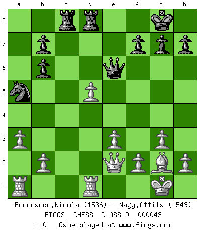 Last move : 1-0 2007 October 23 19:54:59 [Event "FICGS__CHESS__CLASS_D__000043"] [Site "FICGS"] [Date "2007.05.01"] [Round "1"] [White "Broccardo,Nicola"] [Black "Nagy,Attila"] [Result "1-0"] [WhiteElo "1536"] [BlackElo "1549"] 1.c4 e5 2.Nc3 Nf6 3.Nf3 d5 4.cxd5 c6 5.Nxe5 cxd5 6.Qa4+ Bd7 7.Nxd7 Nbxd7 8.g3 Bc5 9.d4 Bb6 10.Bg2 O-O 11.O-O Re8 12.Qc2 Rc8 13.Qd1 Nb8 14.Bg5 Nc6 15.e3 Qd6 16.Bxf6 Qxf6 17.Nxd5 Qg6 18.Nxb6 axb6 19.a3 Red8 20.Qe2 Qe6 21.Rfd1 Na5 22.d5 1-0 This chess game has been lost on time (started : 2007.05.01 21:38:9) English Opening Kingside Castling by player Black (move 10) Kingside Castling by player White (move 11) Player White won this chess game. Follow this game move after move (download)Chess is a terrible game. If you have no center, your opponent has a freer position. If you do have a center, then you really have something to worry about ! (Siegbert Tarrasch) Wie ich sie so einen nach dem anderen nieder mähte wurde meine Überlegenheit offensichtlich. (José Raúl Capablanca) El juego de Damas es para vagabundos. (Paul Morphy) Des points faibles ou des trous dans la position de l'adversaire doivent être occupés par des pièces et non pas par des pions. (Siegbert Tarrasch) The leaves of memory seemed to make a mournful rustling in the dark. (Henry Wadsworth Longfellow)