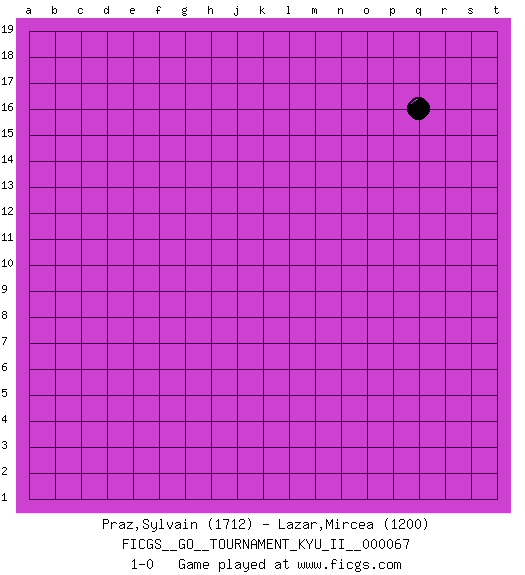 Last move : 1-0 2018 April 26 21:58:24 [Event "FICGS__GO__TOURNAMENT_KYU_II__000067"] [Site "FICGS"] [Date "2018.03.27"] [Round "1"] [Black "Praz,Sylvain"] [White "Lazar,Mircea"] [Result "1-0"] [Rating 1 "1712"] [Rating 2 "1200"] 1.q16 1-0 This go game has been lost on time (started : 2018.03.27 12:43:29) Here are the names of the openings (joseki) played in the four corners : Player Black won this Go (weiqi, baduk) game. Follow this game move after move (download)Capture what you cut off. (Anonymous) He is a liar. I just don't know what the lie is yet. (Horatio Caine, C.S.I. Miami)