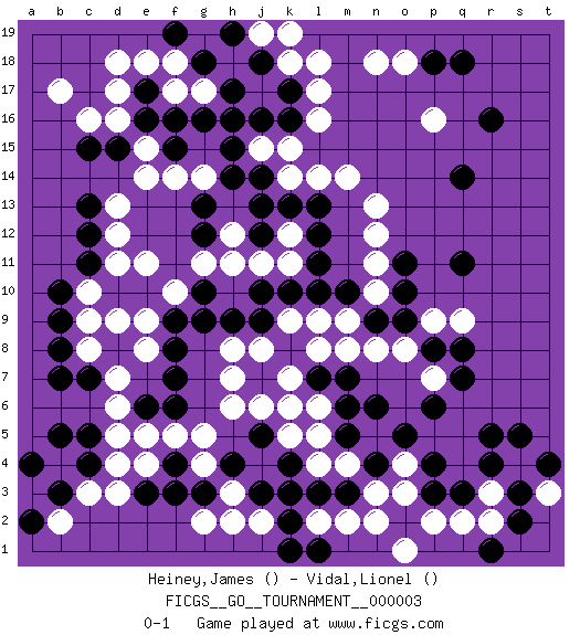 Last move : 0-1 2006 August 21 20:14:29 [Event "FICGS__GO__TOURNAMENT__000003"] [Site "FICGS"] [Date "2006.06.03"] [Round "1"] [Black "Heiney,James"] [White "Vidal,Lionel"] [Result "0-1"] 1.r16 d17 2.p3 c3 3.c15 d12 4.e16 d16 5.d15 e15 6.f15 e14 7.c13 f18 8.e17 e18 9.f16 f14 10.h16 b17 11.c12 d11 12.c11 c10 13.b10 c9 14.b9 p16 15.q14 l16 16.k17 l17 17.k16 k14 18.h14 h12 19.j13 k12 20.k13 l14 21.l13 n13 22.l12 k11 23.q11 n11 24.q18 o18 25.p18 n18 26.e3 d5 27.h4 h6 28.f6 f5 29.f4 g5 30.e6 e5 31.c7 d6 32.d8 d7 33.f8 c8 34.b7 e8 35.b8 d9 36.b5 b4 37.c5 e4 38.f3 d3 39.c4 d4 40.b3 b2 41.a4 k3 42.k4 h2 43.j3 j2 44.l3 g4 45.g3 h3 46.k2 g2 47.a2 j15 48.j14 k15 49.h15 g17 50.h17 m14 51.g13 d13 52.j12 j11 53.g12 g11 54.l11 m9 55.l10 l9 56.k10 j8 57.j10 h11 58.h9 f10 59.g9 h7 60.f9 e9 61.f7 k18 62.j18 l18 63.g16 g14 64.g18 f17 65.f19 d18 66.j16 j19 67.h19 k19 68.k8 k9 69.j9 h8 70.g10 e11 71.m10 n10 72.n9 n8 73.o9 m8 74.l7 o8 75.p8 p9 76.o10 p7 77.q8 q9 78.o11 n12 79.q7 k7 80.k6 l8 81.p6 r3 82.r5 s4 83.s5 q2 84.s2 p2 85.t4 t3 86.s3 o3 87.p4 o4 88.o5 n5 89.n6 m2 90.n4 n3 91.m3 l2 92.k1 m4 93.m5 l5 94.m6 l4 95.k3 l6 96.m7 k5 97.j5 j6 98.n4 k6 99.l1 n2 100.r4 r2 101.q3 c16 102.r1 o1 0-1 Here are the names of the openings (joseki) played in the four corners : Corner d16 : d17 c15 Komoku (Somok, Xiao~mu`) 3-4 Point. The komoku (3-4) point is the traditional corner enclosure move.. Ikken Kakari (Hankan Keolch'im, Yi Gua`jiao~, 1-Space Low Pincer). The small knight move is the basic approach move to the 3-4 point stone. It has been continually used for over four centuries. There are limitless variations, with new moves constantly being discovered. Black 2 opens the door to a treaure store of joseki. Corner q16 : r16 p16 Komoku (Somok, Xiao~mu`) 3-4 Point. The komoku (3-4) point is the traditional corner enclosure move.. Ikken Takagakari (Hankan Nop'dakeolch'im, Yi Gaogua`jiao~, 1-Space High Approach). The 5-4 approach move has become more popular in modern times, as modern Go emphasizes speed and influence. Player White won this Go (weiqi, baduk) game. Follow this game move after move (download)Each step in a ladder is worth 7 points. (Anonymous) The obstacle is the path. (Zen proverb)