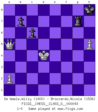 Last move : 1-0 2007 May 23 9:16:34 [Event "FICGS__CHESS__CLASS_D__000043"] [Site "FICGS"] [Date "2007.05.01"] [Round "1"] [White "De Waele,Willy"] [Black "Broccardo,Nicola"] [Result "1-0"] [WhiteElo "1400"] [BlackElo "1536"] 1.e4 d6 2.d4 Nf6 3.Bd3 e5 4.c3 d5 5.dxe5 Nxe4 6.Nd2 Nc6 7.Ngf3 Bg4 8.O-O Nxd2 9.Bxd2 Be7 10.Re1 Qd7 11.Qc2 Bxf3 12.Bf5 Qd8 13.gxf3 g6 14.Bh3 Bc5 15.Qa4 O-O 16.Bh6 Re8 17.Qf4 Bf8 18.Bxf8 Rxf8 19.Rad1 Kg7 20.Qg3 Ne7 21.f4 Kh8 22.Qg5 Nc8 23.c4 Nb6 24.cxd5 Nxd5 25.Qh6 c6 26.f5 Rg8 27.f6 Qf8 28.Qc1 Qb4 29.Bg2 Qh4 30.Re4 Qh5 31.Rd3 Qf5 32.Rb3 Rab8 33.Ra3 Ra8 34.Qc4 Rge8 35.Rf3 Qg5 36.Rg3 Qd2 37.Rb3 Rab8 38.Re2 Qd1+ 39.Bf1 h5 40.Qh4 Qc1 41.Re4 Kg8 42.f4 Qc5+ 43.Kh1 Qc1 44.Rf3 Qxb2 45.f5 Rxe5 46.fxg6 Rf8 47.Rg4 Qb1 48.Rg1 Qe4 49.Qg3 Rf5 50.Bg2 Nxf6 51.gxf7+ Kh8 52.R3f1 Qc2 53.Bf3 Rxf7 54.Qg6 Ng4 55.Bxg4 Rxf1 56.Qxc2 Rxg1+ 57.Kxg1 hxg4 58.Kg2 a6 59.Qg6 Rg7 60.Qe8+ Kh7 61.Kg3 Rg8 62.Qh5+ Kg7 63.Kxg4 Kf6 64.Kf3 Rg7 65.h4 Ke7 66.Qe5+ Kf7 67.h5 Kg8 68.Qe4 Kh8 69.Qf5 Rg8 70.Ke4 Rg7 71.Kd4 a5 72.Qxa5 1-0 King's pawn Opening Kingside Castling by player White (move 8) Kingside Castling by player Black (move 15) 10 pieces endgame at move 57 : White KQPP , Black KRPPPP WHITE : King + 1 Queen 2 Pawns BLACK : King + 1 Rook 4 Pawns 9 pieces endgame at move 63 : White KQPP , Black KRPPP WHITE : King + 1 Queen 2 Pawns BLACK : King + 1 Rook 3 Pawns 8 pieces endgame at move 72 : White KQPP , Black KRPP WHITE : King + 1 Queen 2 Pawns BLACK : King + 1 Rook 2 Pawns Player White won this chess game. Follow this game move after move (download)Chess books should be used as we use glasses: to assist the sight, although some players make use of them as if they thought they conferred sight. (Jose Raul Capablanca) Oft bringt ein stiller Zug das Erdbeben. (Richard Reti) Uno no tiene que jugar muy bien, es suficiente jugar mejor que el oponente. (Siegbert Tarrasch) Un journaliste : 'Vous préférez avoir une dame de plus sur l'échiquier ou au lit ?' Boris Spassky : 'Ca dépend de la position.' The age of a woman doesn't mean a thing. The best tunes are played on the oldest fiddles. (Ralph Waldo Emerson)