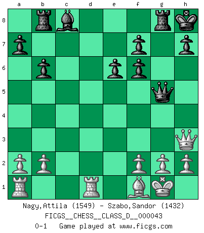 Last move : 0-1 2007 October 10 6:10:40 [Event "FICGS__CHESS__CLASS_D__000043"] [Site "FICGS"] [Date "2007.05.01"] [Round "1"] [White "Nagy,Attila"] [Black "Szabo,Sandor"] [Result "0-1"] [WhiteElo "1549"] [BlackElo "1432"] 1.e4 d5 2.exd5 Nf6 3.c4 c6 4.Nc3 cxd5 5.d4 Nc6 6.Bg5 e6 7.Nf3 Be7 8.Bd3 dxc4 9.Bxc4 O-O 10.O-O b6 11.Qe2 Nxd4 12.Nxd4 Qxd4 13.Rfd1 Qc5 14.Qf3 Rb8 15.Bxf6 Bxf6 16.Ne4 Qe5 17.Nxf6+ gxf6 18.Qg4+ Qg5 19.Qh3 Kh8 20.Bf1 Rg8 0-1 This chess game has been lost on time (started : 2007.05.01 21:38:9) Scandinavian gambit Kingside Castling by player Black (move 9) Kingside Castling by player White (move 10) Player Black won this chess game. Follow this game move after move (download)The laws of Chess do not permit a free choice: you have to move whether you like it or not. (Emanuel Lasker) Charakterschwächen offenbaren sich normalerweise während einer Schachpartie. (Garry Kasparov) Debes de llevar a tu oponente hacia un profundo y obscuro bosque donde 2+2=5, y el camino que conduce a la salida es suficientemente ancho para solamente uno. (Mikhail Tal) Ce qui caractérise les parties de combat, c'est que si le défenseur a constamment de difficiles problèmes à résoudre, l'attaquant doit chercher sans relâche de nouvelles possibilités d'attaque. (Koblentz) Luck never gives; it only lends. (Swedish proverb)