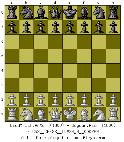 Last move : 0-1 2018 May 9 10:53:59 [Event "FICGS__CHESS__CLASS_B__000269"] [Site "FICGS"] [Date "2018.03.29"] [Round "1"] [White "Diedtrich,Artur"] [Black "Beycan,Azer"] [Result "0-1"] [WhiteElo "1800"] [BlackElo "1800"] 0-1 This chess game has been lost on time (started : 2018.03.29 23:49:47) Player Black won this chess game. Follow this game move after move (download)Chess is imagination. (David Bronstein) Über Frauen: Chess is better. (Robert James Fischer) El Rey es una pieza de pelea. ¡Usenlo!. (Wilhelm Steinitz) Roi des jeux et jeu des rois, les échecs portent en eux un sentiment d'infini. Ils donnent à celui qui s'est efforcé d'en approfondir les arcanes l'impression de n'être pas à la mesure de l'homme; en fait, ils constituent un résumé de l'univers, un microcosme, et figurent cette grande échelle qui, dans les plans de la lumière descend jusqu'à la matière, qui des abîmes insondables remonte jusqu'en l'infini de Dieu. (Pyrame) Convictions are more dangerous enemies of truth than lies. (Friedrich Nietzsche)