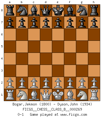 Last move : 0-1 2018 May 9 10:53:59 [Event "FICGS__CHESS__CLASS_B__000269"] [Site "FICGS"] [Date "2018.03.29"] [Round "1"] [White "Bogar,Jekmon"] [Black "Dyson,John"] [Result "0-1"] [WhiteElo "1800"] [BlackElo "1934"] 0-1 This chess game has been lost on time (started : 2018.03.29 23:49:47) Player Black won this chess game. Follow this game move after move (download)That's what Chess is all about. One day you give your opponent a lesson, the next day he gives you one. (Bobby Fischer) Die Auseinandersetzung mit Karpow war politisch geprägt. Er stand für das kommunistische System, wurde von dessen Repräsentanten gehätschelt. Ich war der Oppositionelle. Jeder Schachweltmeister spiegelt auch die gesellschaftlichen Verhältnisse wider. Kramnik steht für die Börsen-Generation des Neuen Markts, ideologiefrei, zahlenfixiert. (Garry Kasparov) El jugador táctico debe saber que hacer cuando algo se debe de hacer. El estratégico debe saber que hacer cuando nada se debe de hacer. (Savielly Tartakover) Les Echecs sont affaire de jugement sensible. Savoir quand frapper et quand esquiver. (Fischer) If only people were all showed a certain minimum level of niceness; if only people didn't retract verbal draw offers (without draw box ticked) on ficgs; if only people didn't kill; if only people didn't run concentration / extermination camps, if only people didn't drop nuclear bombs on Hiroshima and Nagasaki, and so on - it would be a much more beautiful world. But sadly, things are not so... (Normajean Yates)