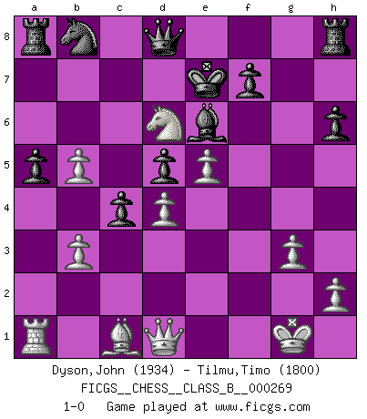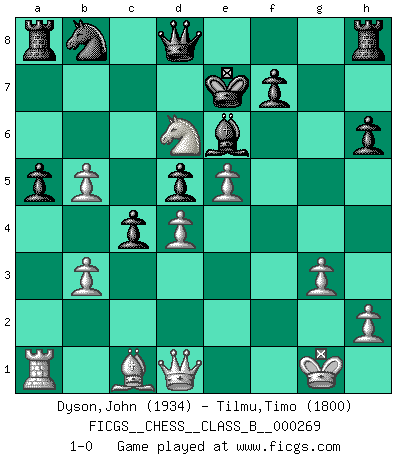 Last move : 1-0 2018 August 2 20:56:50 [Event "FICGS__CHESS__CLASS_B__000269"] [Site "FICGS"] [Date "2018.03.29"] [Round "1"] [White "Dyson,John"] [Black "Tilmu,Timo"] [Result "1-0"] [WhiteElo "1934"] [BlackElo "1800"] 1.Nf3 Nf6 2.c4 e6 3.Nc3 d5 4.d4 c6 5.g3 dxc4 6.Bg2 b5 7.O-O Bb7 8.e4 Be7 9.a4 a6 10.e5 Nd5 11.Ne4 h6 12.Nh4 a5 13.f4 g6 14.f5 exf5 15.Rxf5 gxf5 16.Nxf5 Bc8 17.Nfd6+ Bxd6 18.Nxd6+ Ke7 19.Bxd5 cxd5 20.axb5 Be6 21.b3 1-0 Reti Opening Kingside Castling by player White (move 7) Player White won this chess game. Follow this game move after move (download)During a Chess competition a Chessmaster should be a combination of a beast of prey and a monk. (Alexander Alekhine) Offensichtlich kennt Kasparow nichts anderes als Schach, und ich könnte 500 weitere Spieler dieser Sorte benennen. (Judith Polgar) Con o sin el título, Bobby Fischer fue sin lugar a dudas el mas grande jugador de su época. (Burt Hochberg) Ce qui caractérise les parties de combat, c'est que si le défenseur a constamment de difficiles problèmes à résoudre, l'attaquant doit chercher sans relâche de nouvelles possibilités d'attaque. (Koblentz) The project of the man are lower than those of the sky. (Chinese proverb)