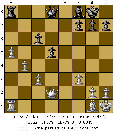 Last move : 1-0 2007 December 14 20:21:53 [Event "FICGS__CHESS__CLASS_D__000043"] [Site "FICGS"] [Date "2007.05.01"] [Round "1"] [White "Lopez,Victor"] [Black "Szabo,Sandor"] [Result "1-0"] [WhiteElo "1627"] [BlackElo "1432"] 1.e4 d5 2.exd5 Nf6 3.Bb5+ Bd7 4.Bc4 Bg4 5.f3 Bc8 6.Nc3 Nbd7 7.d4 Nb6 8.Bb5+ Bd7 9.Bd3 Nbxd5 10.Nxd5 Nxd5 11.Ne2 c5 12.c3 e6 13.O-O cxd4 14.Nxd4 Bc5 15.Be4 Bb5 16.Re1 O-O 17.Kh1 Bc4 18.Qa4 Ba6 19.Bd2 Qh4 20.Bxd5 exd5 21.Be3 Bd6 22.Bg1 Rfd8 23.Qa5 Qh5 24.Rad1 Bg3 25.Re7 Kf8 26.Nc6 Rd6 27.Qa3 bxc6 28.Rd7 Qh6 29.Rxd6 Bxd6 30.Qxa6 Be7 31.Re1 Qd6 32.Qb7 Rd8 33.Qxa7 Rd7 34.Qa4 Rd8 35.b4 Qc7 36.Qc2 Kg8 37.a4 Ra8 38.Qd2 Bf8 39.a5 Qd8 40.Ra1 1-0 Scandinavian defense Kingside Castling by player White (move 13) Kingside Castling by player Black (move 16) Player White won this chess game. Follow this game move after move (download)Pawn endings are to Chess what putting is to golf. (Cecil Purdy) Lisa Lane, amerikanische Schachmeisterin, hatte Fischer einmal als stärksten lebenden Spieler bezeichnet. Antwort: Das ist richtig, aber Lisa Lane ist eigentlich nicht in der Lage, das zu beurteilen. (Robert James Fischer) Ciertamente, de todas la drogas del mundo, el Ajedrez debe ser el mas placentero permamentemente. (Assiac) Psychologiquement, tu dois avoir confiance en toi même, mais cette confiance doit être basée sur des faits. (Robert Fischer) Over-the-board chess is the favorite of mortals, correspondence chess is the favorite of the gods. (Eduard Dyckhoff)