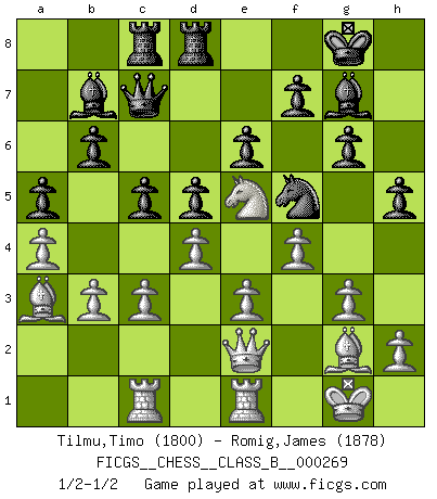 Last move : 1/2-1/2 2018 April 7 12:42:39 [Event "FICGS__CHESS__CLASS_B__000269"] [Site "FICGS"] [Date "2018.03.29"] [Round "1"] [White "Tilmu,Timo"] [Black "Romig,James"] [Result "1/2-1/2"] [WhiteElo "1800"] [BlackElo "1878"] 1.d4 Nf6 2.Nf3 e6 3.e3 c5 4.Bd3 d5 5.c3 b6 6.O-O Bb7 7.Ne5 Bd6 8.f4 O-O 9.Nd2 Nc6 10.b3 Ne7 11.Bb2 Nf5 12.Qe2 Rc8 13.Rad1 Qe7 14.Rfe1 Rfd8 15.g3 g6 16.Ng4 Nxg4 17.Qxg4 Qc7 18.a4 Bf8 19.Bf1 Nd6 20.Qe2 Bg7 21.Rc1 Nf5 22.Bg2 Qe7 23.Nf3 h5 24.Ne5 a5 25.Rcd1 Kh7 26.Rb1 Qc7 27.Rbc1 Kg8 28.Ba3 Nd6 29.Qf1 Qe7 30.Qe2 Qc7 31.Red1 Nf5 32.Re1 Nd6 33.Bf1 Nf5 34.Bg2 1/2-1/2 Queen's pawn : Yusupov-Rubinstein system Kingside Castling by player White (move 6) Kingside Castling by player Black (move 8) This chess game ended in a draw. Follow this game move after move (download)The winner of the game is the player who makes the next-to-last mistake. (Savielly Tartakover) Es gibt keine einzige Frau, der ich nicht einen Springer vorgeben könnte und trotzdem gewänne. (Robert James Fischer) Algunos sacrificios son sólidos, los demás son míos. (Mikhail Tal) Les Cavaliers se révèlent fort utiles dans les positions fermées. D'habitude, les Fous sont un peu plus forts que les Cavaliers dans les positions ouvertes. Qu'on le veuille ou non, il restera toujours des exceptions ! You lose, general Kenobi. (General Grievous in Star Wars ep.3)