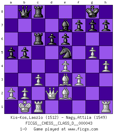 Last move : 1-0 2007 September 14 14:18:30 [Event "FICGS__CHESS__CLASS_D__000043"] [Site "FICGS"] [Date "2007.05.01"] [Round "1"] [White "Kis-Kos,Laszlo"] [Black "Nagy,Attila"] [Result "1-0"] [WhiteElo "1512"] [BlackElo "1549"] 1.e4 c5 2.Nf3 d6 3.d4 cxd4 4.Nxd4 Nf6 5.Nc3 a6 6.Be3 e6 7.Qd2 Be7 8.f3 O-O 9.O-O-O b5 10.g4 Bb7 11.g5 Nfd7 12.h4 Nc6 13.Nxc6 Bxc6 14.Ne2 Rc8 15.Nd4 Ne5 16.Nxc6 Rxc6 17.Be2 Qb8 18.Kb1 Rfc8 19.c3 a5 20.Rc1 1-0 This chess game has been lost on time (started : 2007.05.01 21:38:9) Sicilian : Najdorf, Byrne (English) attack Kingside Castling by player Black (move 8) Queenside Castling by player White (move 9) Player White won this chess game. Follow this game move after move (download)I play correspondence chess because it is both art and science while chess is art only. (A player at FICGS) Es hat in meinem Leben Zeiten gegeben, da ich sehr nahe daran war zu glauben, daß ich auch nicht eine einzige Schachpartie verlieren könnte. (José Raúl Capablanca) Una partida de Ajedrez se divide en 3 etapas: la primera cuando piensas que tienes la ventaja, la segunda cuando crees que tienes la ventaja y la tercera... ¡cuando te das cuenta que vas a perder!. (Savielly Tartakower) Botvinnik disait en comparant les échecs à la musique: Il existe une science dont le but est l'étude de l'acoustique et des sons. Mais il y a aussi un art qui se sert de l'océan des sons : c'est la musique. De toute évidence, il en est de même pour la pensée. La logique est l'étude des lois de la réflexion et les échecs reflètent, en tant qu'art, le côté logique de la réflexion, sous la forme d'images artistiques... Extrait de Fischer - Spassky, Reykjavik 1972 par Alexander & F. Wyndham (Ed. Solar), p 37. The hypothalamus is one of the most important parts of the brain, involved in many kinds of motivation, among other functions. The hypothalamus controls the 'Four Fs: Fighting, Fleeing, Feeding and Mating. (Unknown author)