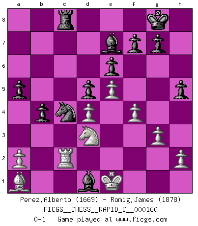 Last move : 0-1 2018 April 12 0:4:8 [Event "FICGS__CHESS__RAPID_C__000160"] [Site "FICGS"] [Date "2018.03.30"] [Round "1"] [White "Perez,Alberto"] [Black "Romig,James"] [Result "0-1"] [WhiteElo "1669"] [BlackElo "1878"] 1.e4 Nf6 2.d3 d5 3.e5 Nfd7 4.d4 c5 5.c3 e6 6.f4 Nc6 7.Nf3 Be7 8.Bd3 Qb6 9.Bc2 cxd4 10.cxd4 Nb4 11.Ba4 Qa6 12.Nc3 Nd3+ 13.Kf1 Nxb2 14.Qe2 Qxe2+ 15.Kxe2 Nxa4 16.Nxa4 b5 17.Nb2 Ba6 18.Kd2 b4 19.Nd3 Rc8 20.Bb2 Nb6 21.Rab1 O-O 22.Rhc1 Bc4 23.Ra1 Na4 24.Nfe1 a5 25.Rc2 Rfd8 26.Nc1 Bf1 27.Ncd3 Rc4 28.Rac1 Rdc8 29.g3 Bh3 30.Ba1 h5 31.Ndf2 Bf5 32.Ned3 Nb6 33.Nd1 Rxc2+ 34.Rxc2 Nc4+ 35.Ke2 Bg4+ 36.Ke1 Bxd1 0-1 Alekhine's defense : Maroczy variation Kingside Castling by player Black (move 21) Player Black won this chess game. Follow this game move after move (download)Chess holds its master in its own bonds, shackling the mind and brain so that the inner freedom of the very strongest must suffer. (Albert Einstein) Die unerbitterlichsten Regeln im Schach sind die Ausnahmen. (Savielly Grigorievitsch Tartakower) Las piezas de Ajedrez son los bloques del alfabeto que moldean los pensamientos; y esos pensamientos, aunque hagan un diseño visual en el tablero, expresan abstractamente su belleza como un poema. (Marcel Duchamp) Dieu déplace le joueur, et celui-ci la pièce. Quel Dieu derrière Dieu commence donc la trame ? Arturo Perez-Reverte (prix de littérature policière 1993). Over-the-board chess is the favorite of mortals, correspondence chess is the favorite of the gods. (Eduard Dyckhoff)